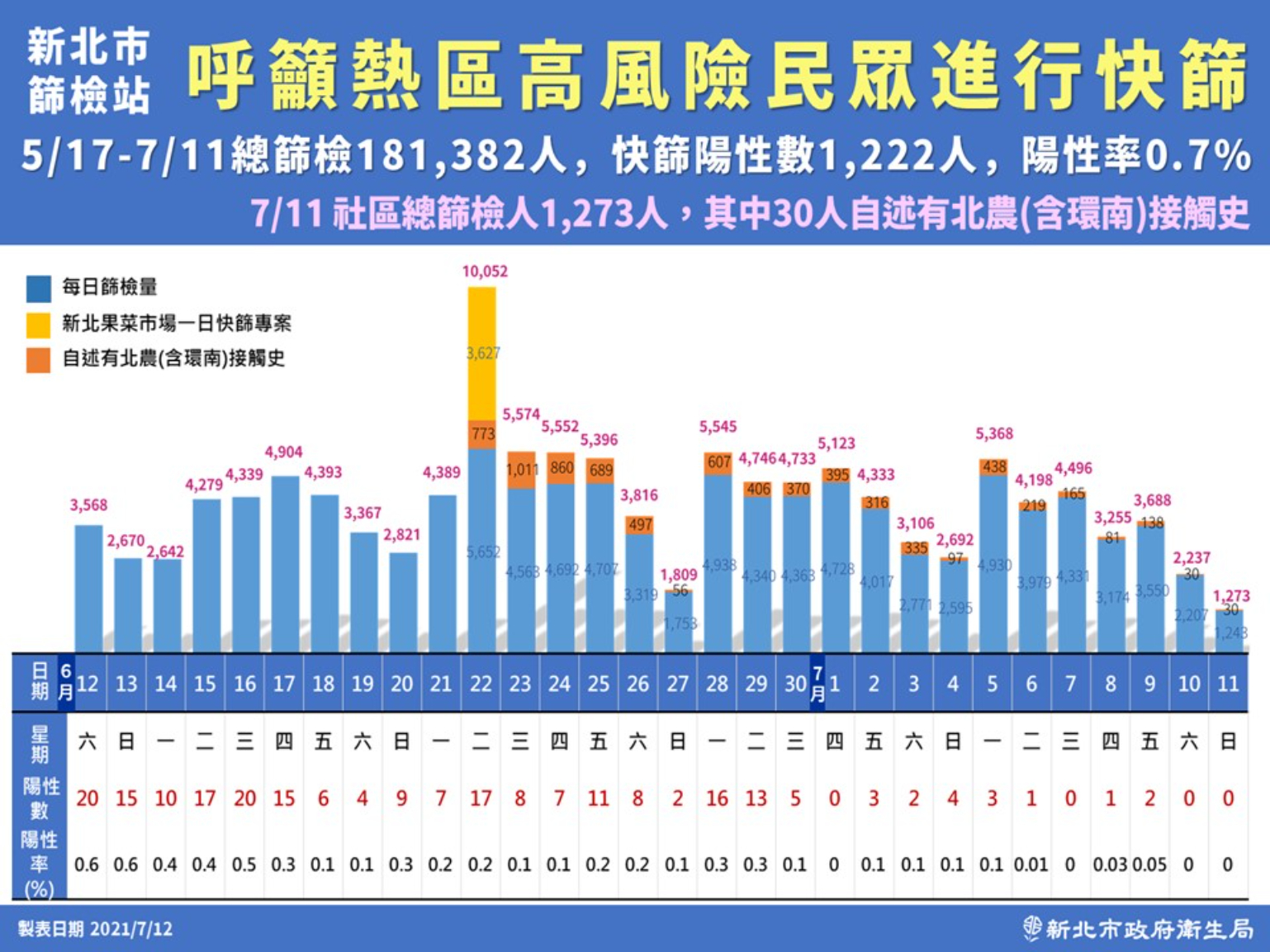 在社區篩檢站的篩檢量統計,總篩檢達18萬1382人,昨天因為假日,篩檢1273人比起平日要少了許多,其中30人自述有北農環南接觸史。
