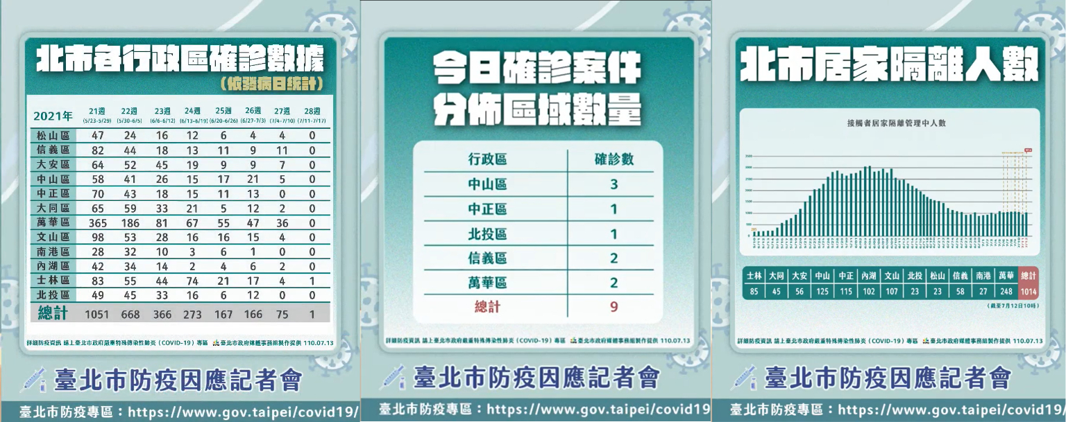 另外,台北市今日新增9例確診,副市長黃珊珊指出,環南市場某攤商從自己到妯娌,一整個家族共有12人確診。市長柯文哲表示,現在比較麻煩就是家戶感染,而這也成為目前北市疫調的主題,而且也還是要當作旁邊可能有確診者,要用這種態度來去處理。