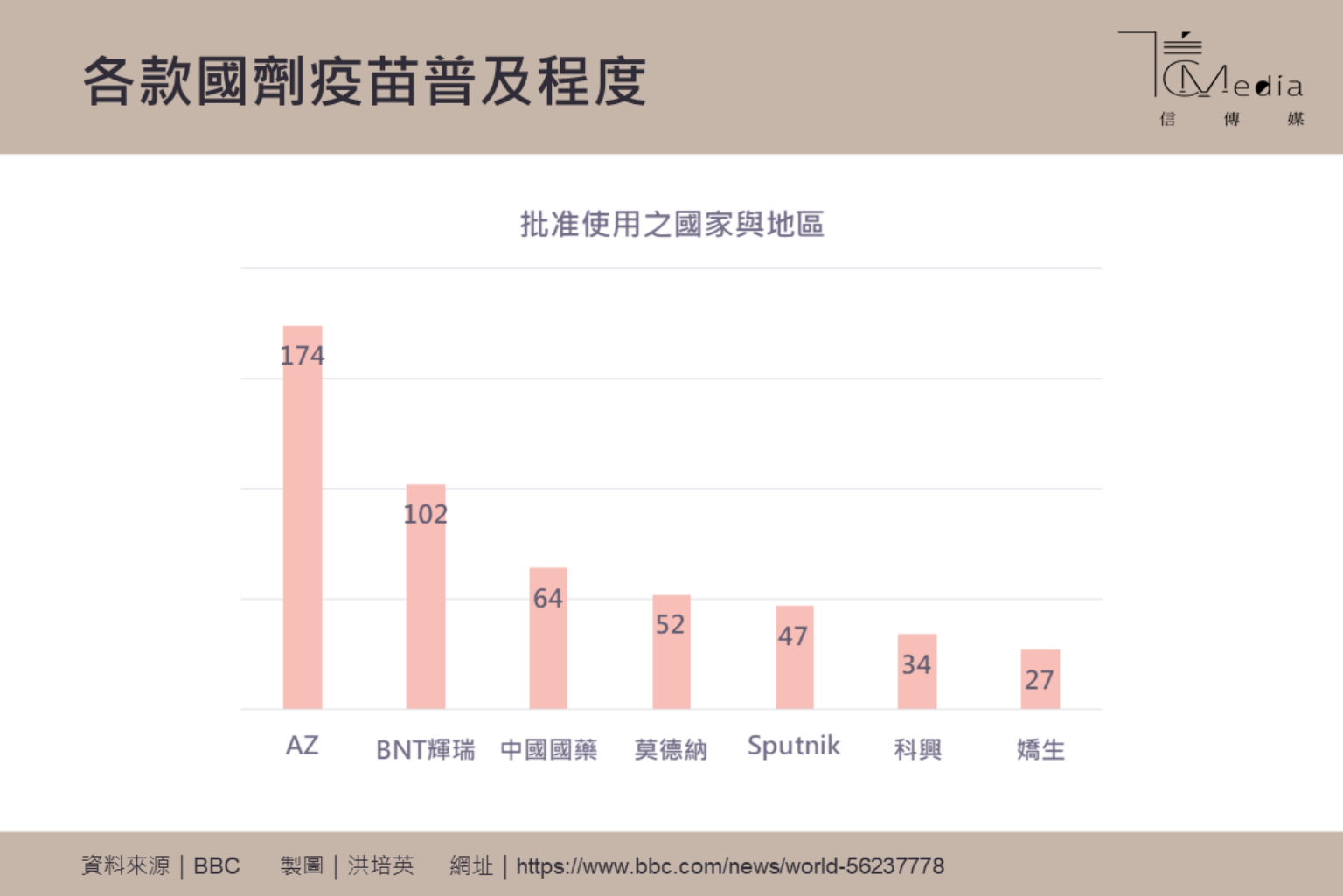 根據《BBC》報導,目前AZ獲得174個國家與地區的完整或緊急授權,居全球之冠。