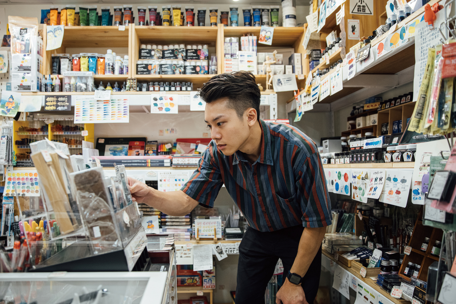 工欲善其事,必先利其器,來到「百色美術」選購適合繪圖工具!踏入置身2樓的店面,琳瑯滿目的商品伴隨繽紛色彩映入眼簾,包括美術畫材、日式風格特色文具、鋼筆墨水及紙品等。美術科班出身的店主蘇志成建議,若想以速寫作為記錄旅程的方式,可挑選簡單好用、攜帶方便的工具入手。例如帶一本輕巧隨身畫冊,以書法尖鋼筆搭配防水墨汁,或用代針筆勾勒輪廓,透過線條粗細變化讓畫面更生動,再以水筆蘸取塊狀水彩組合的顏料上色,就能輕鬆讓美好記憶定格在圖像中!