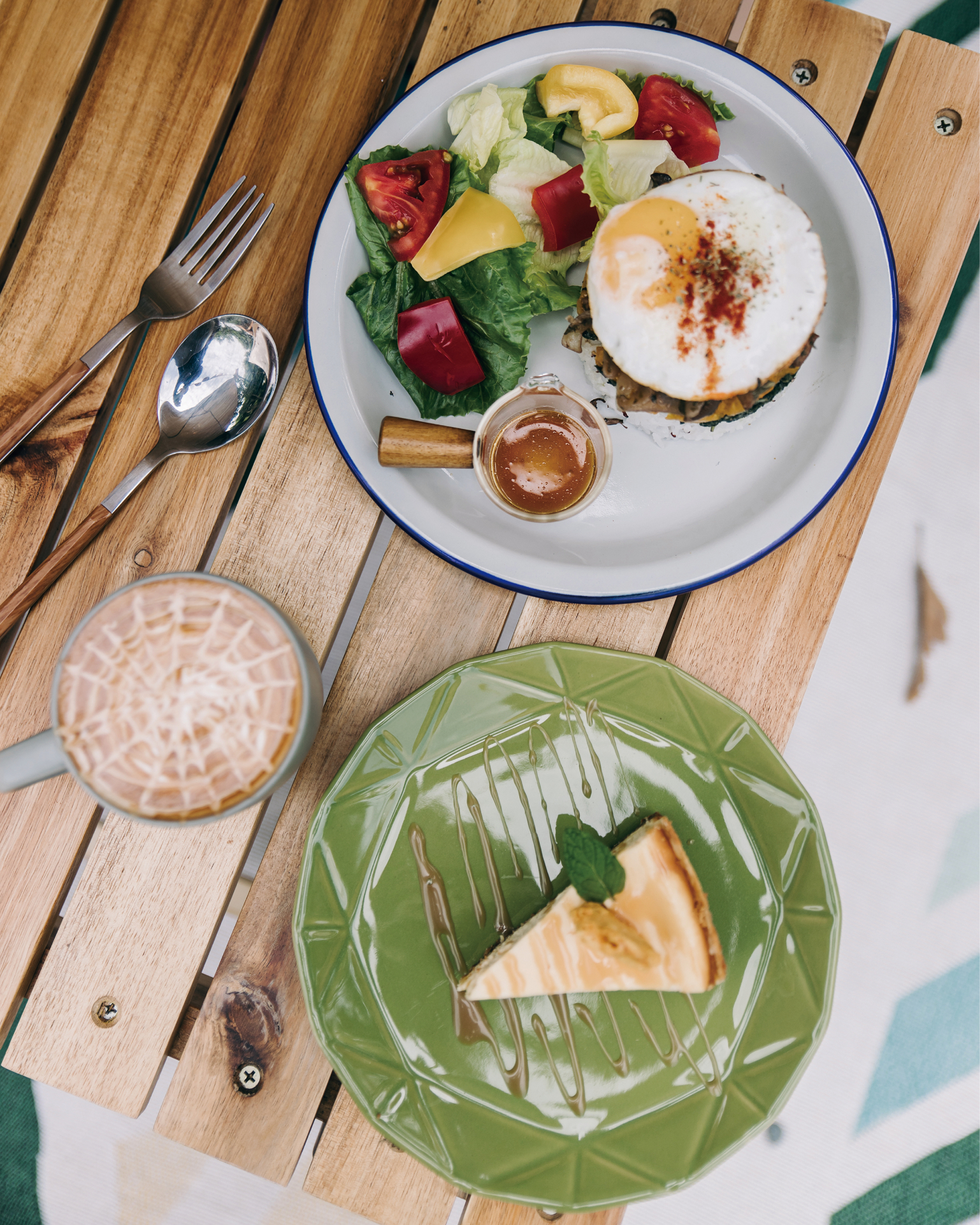 除了享受露營樂趣,店家用心製作的每道餐點也不容錯過,「菇菇味厚比堡」以泰國藜麥飯為底,堆疊義式青醬炒綜合菇、太陽蛋、南瓜泥等配料,附上生菜沙拉健康又滿足;加入微量海鹽的「焦糖海鹽拿鐵」,順口滋味令人幸福無比;手工製作的「五星蜂巢乳酪蛋糕」用燕麥為基底,濃郁的乳酪蛋糕搭配甜蜜蜂巢脆片,堪稱絕配。在樹林中悠閒野餐無比愜意,這時不妨拿起畫筆,將周邊山林美景繪於紙上。