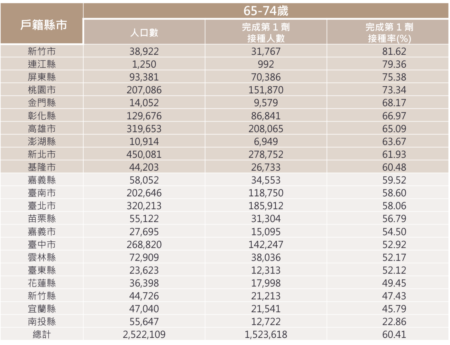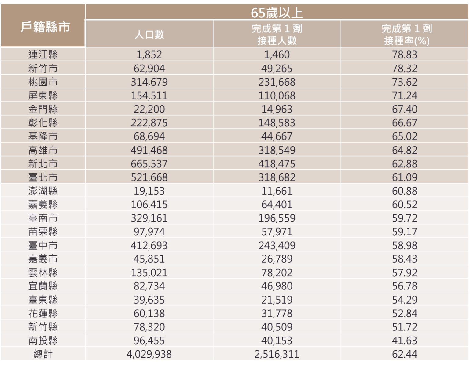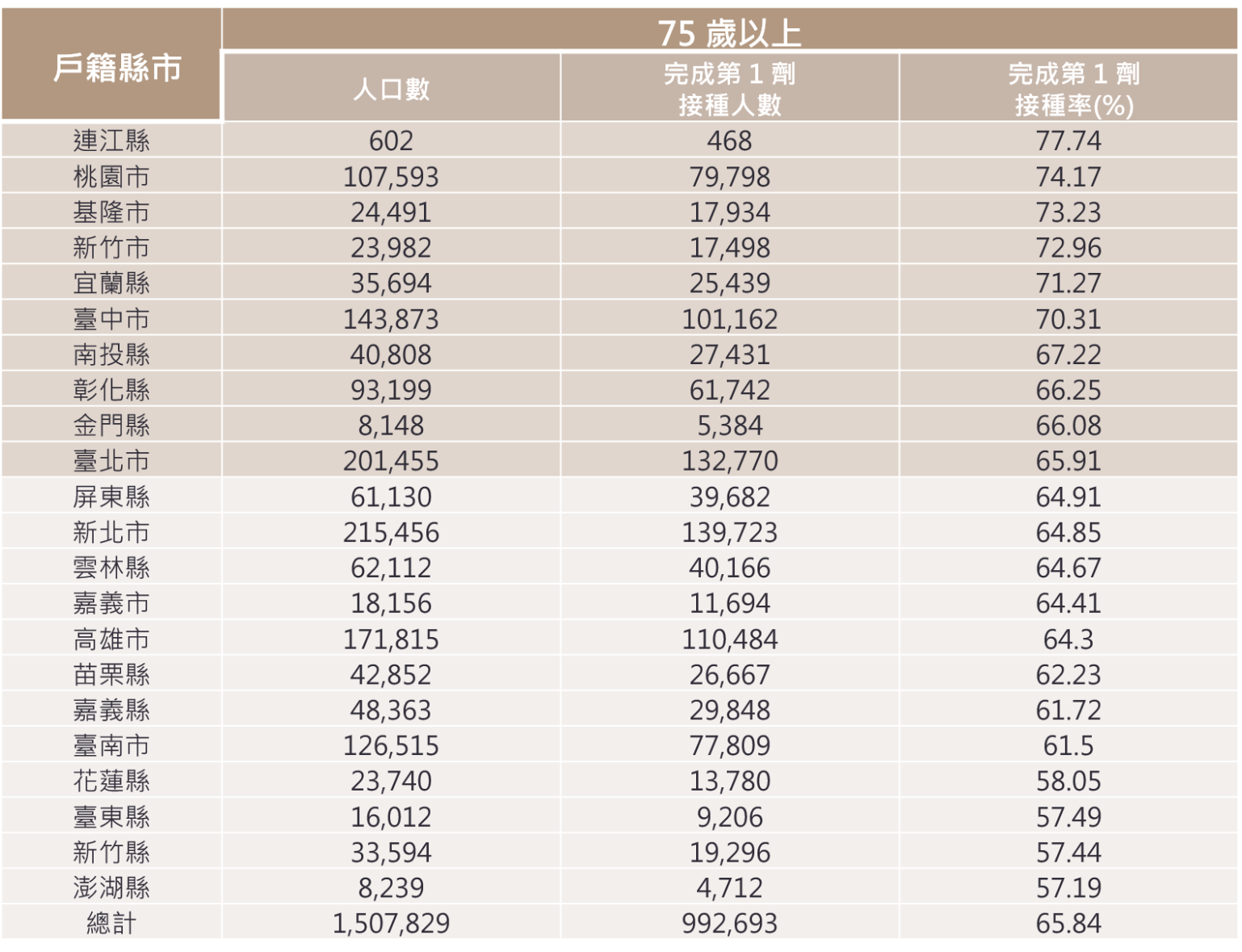 75歲以上長輩疫苗覆蓋數據來看,全國的平均覆蓋率為65.84%,目前僅剩下花蓮縣、台東縣、新竹縣以及澎湖縣尚未突破6成。