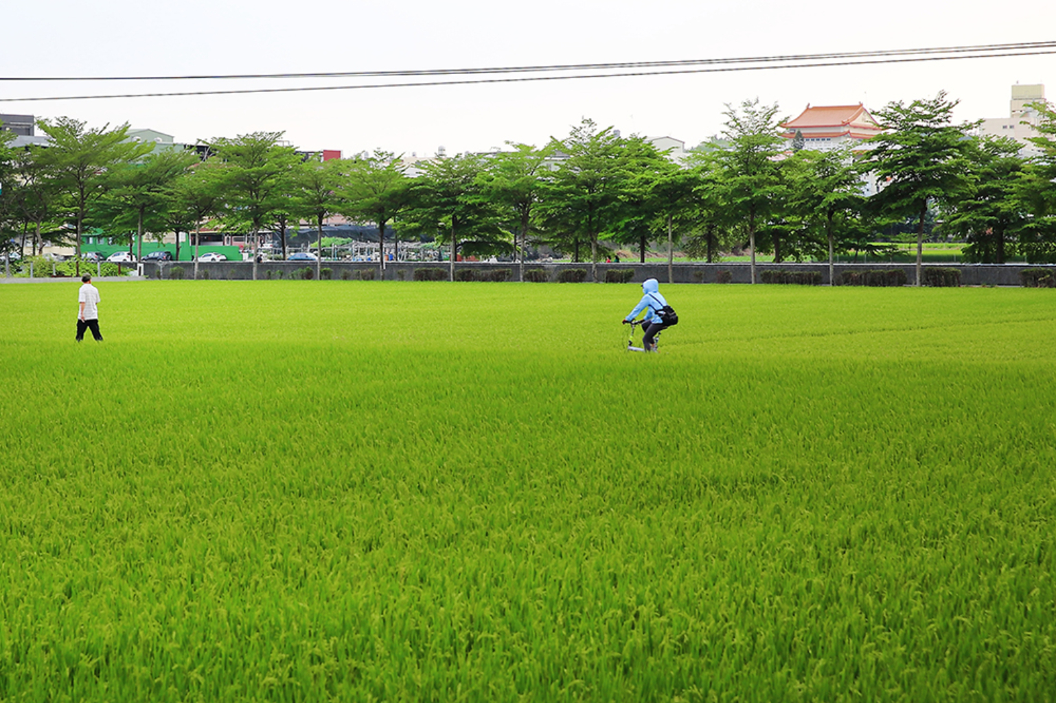 大寮捷西路這條慢跑路線雖地處捷運站旁,但沿途沒有高樓林立,反而一畦畦水稻田夾道零星分布。雨生百穀,時序進入五月,通常是一整片稻浪景觀,田連阡陌彩繪大地色,看起來非常賞心悅目。每年秋收時還可以邊欣賞金黃稻穗,邊聞著稻香前進,彷彿遠離都市塵囂,就算短短幾里路也很紓壓。