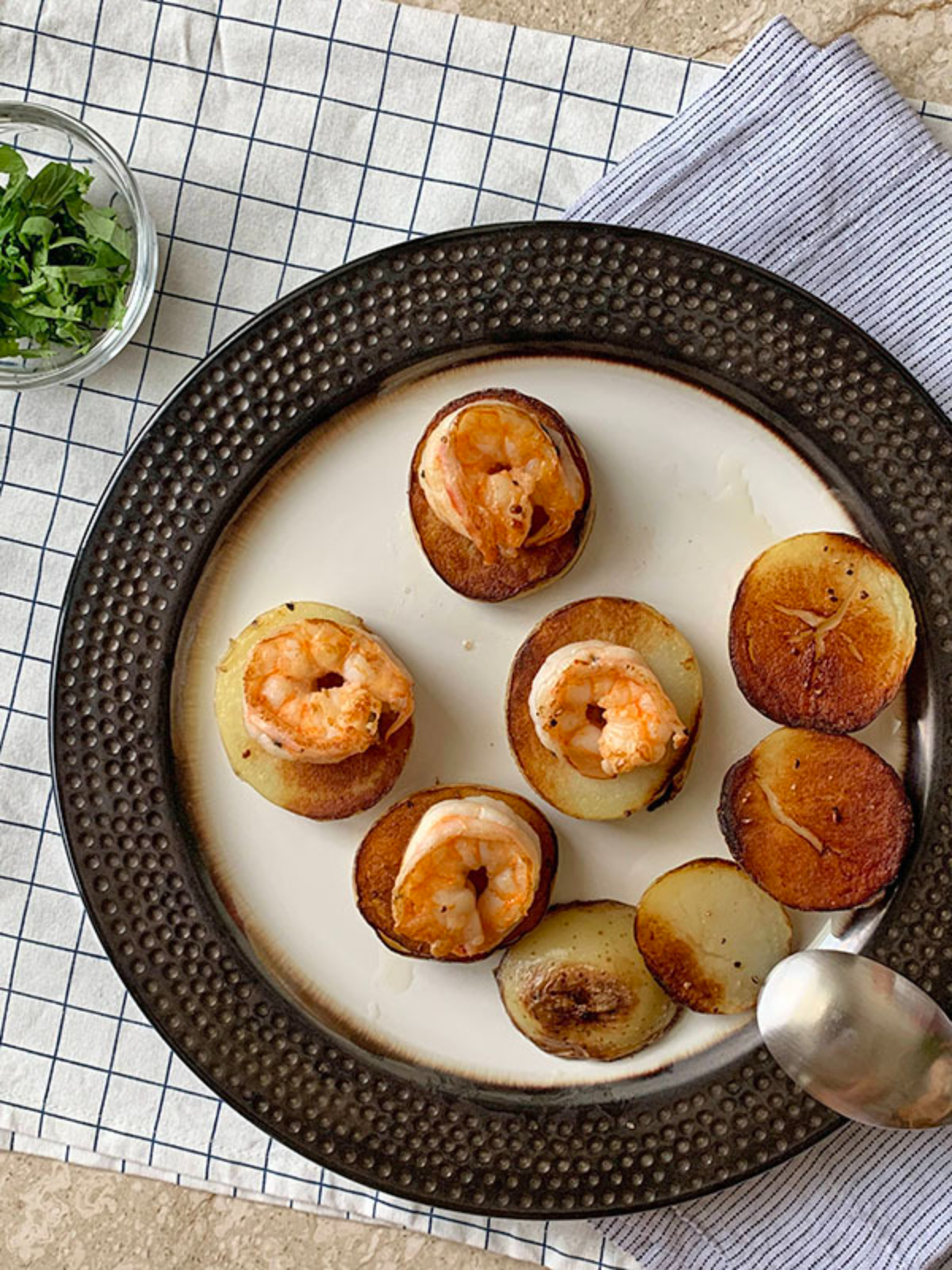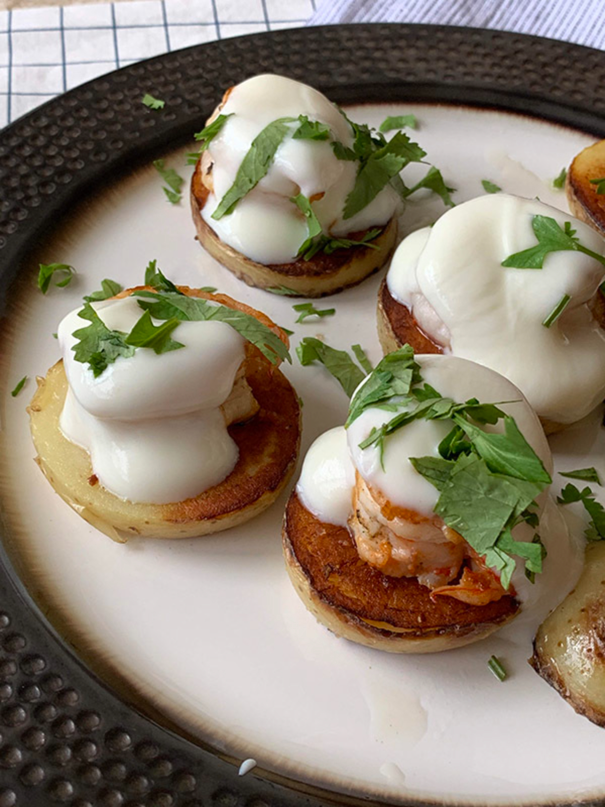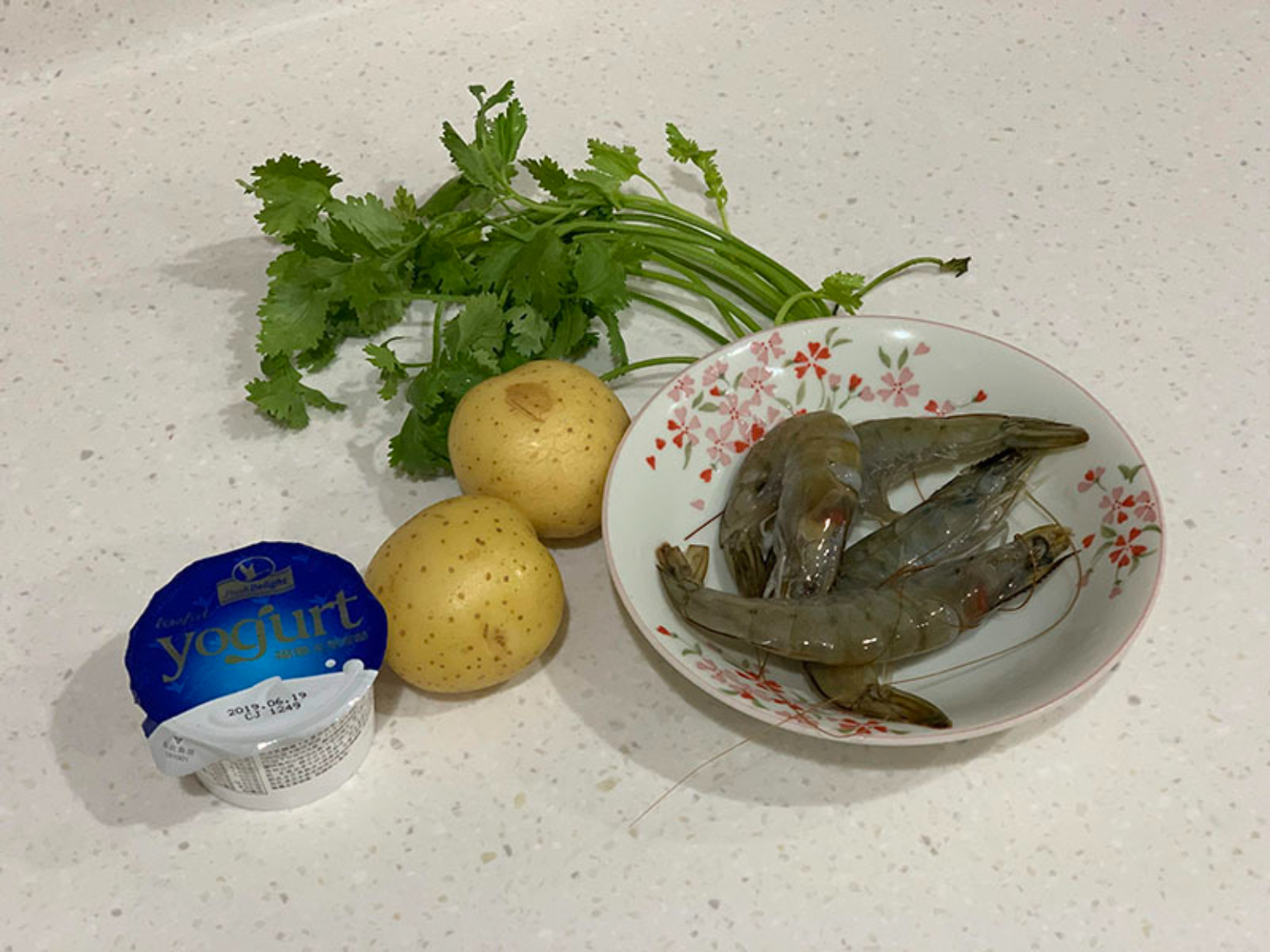 蝦子起鍋後,接著就是擺盤。擺盤部分將蝦子擺在馬鈴薯上,並淋上優格,最後再撒上些許香菜(或是巴西里,但有點難買)就完成了!