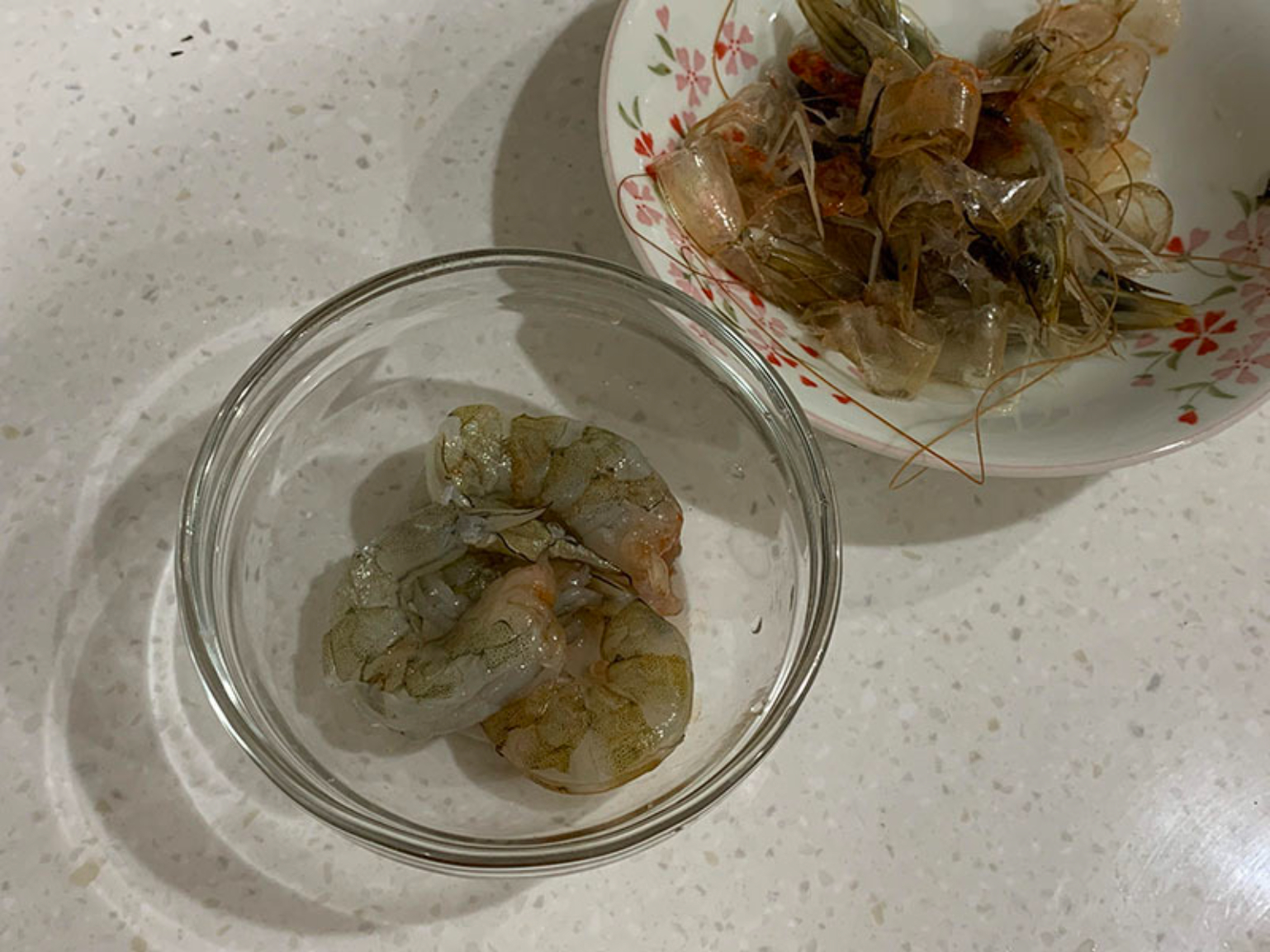 將新鮮白蝦剝殼去泥腸。如果想省略此步驟,可挑選剝好的蝦仁。但我個人覺得現剝蝦子還是最新鮮,而且沒有添加物的疑慮。