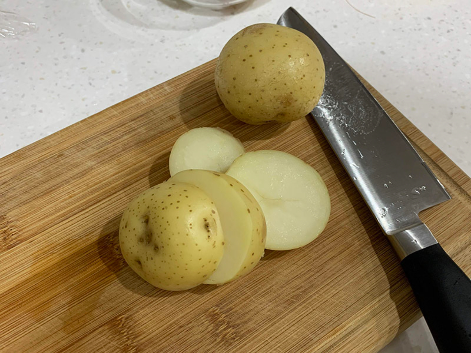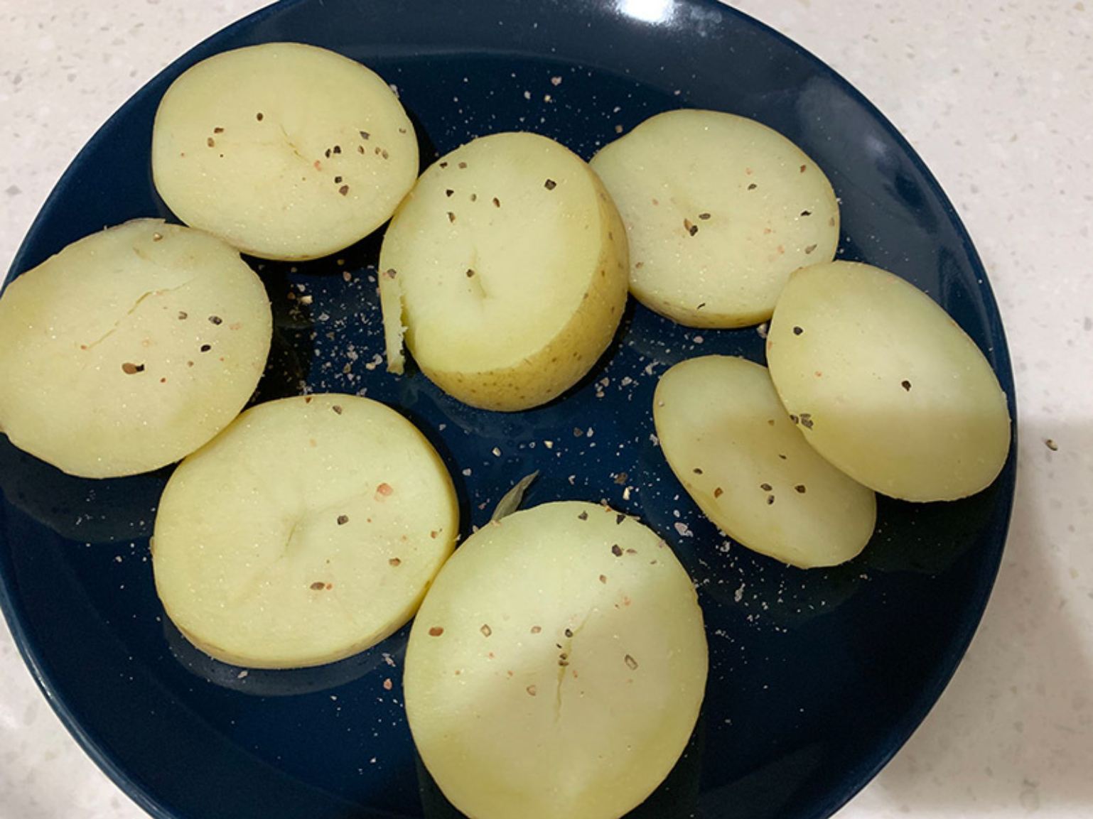 馬鈴薯蒸熟後,將馬鈴薯四等份切片,每片約1~1.5公分。