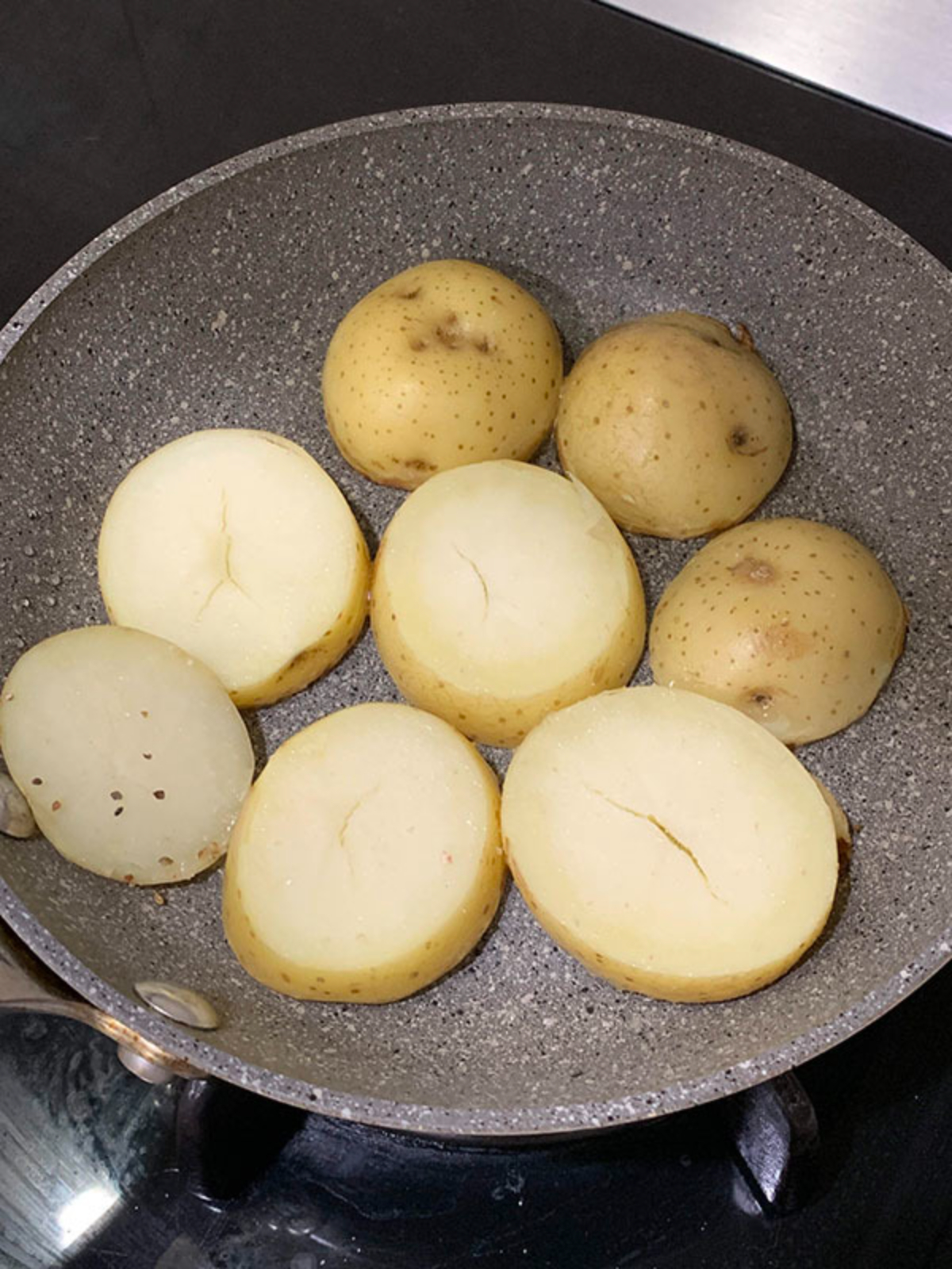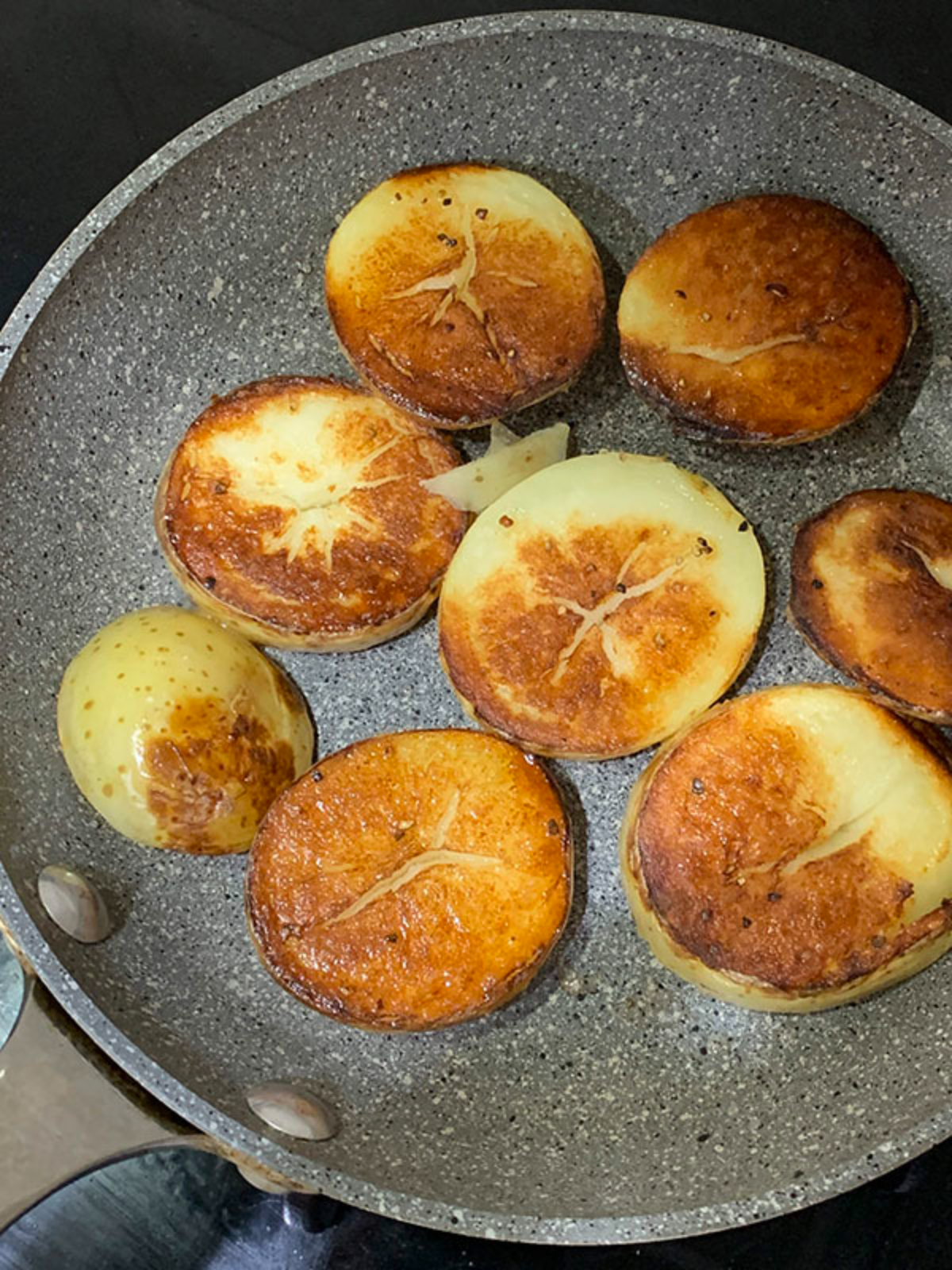熱一平底鍋,放入馬鈴薯。使用中火,講雙面煎到如下圖金黃色(香~)。一面的時間大約是2~3分鐘。