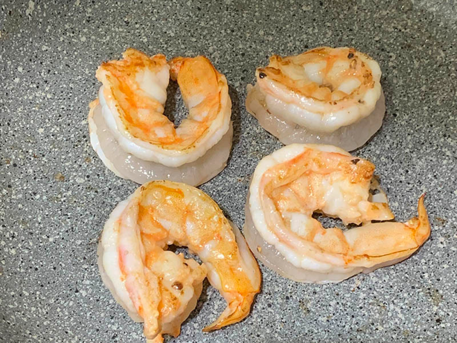 馬鈴薯起鍋備用後,不用換鍋或洗鍋,直接放入蝦子煎熟。