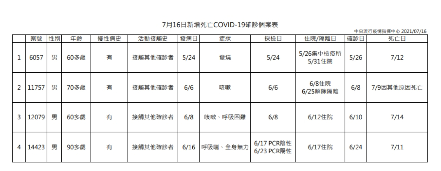 陳時中說明,今日新增4例死亡個案,均為男性,年齡介於60多歲至90多歲,發病日介於5月24日至6月16日,確診日介於5月26日至6月24日,死亡日介於7月9日至7月14日;詳如新聞稿附件。