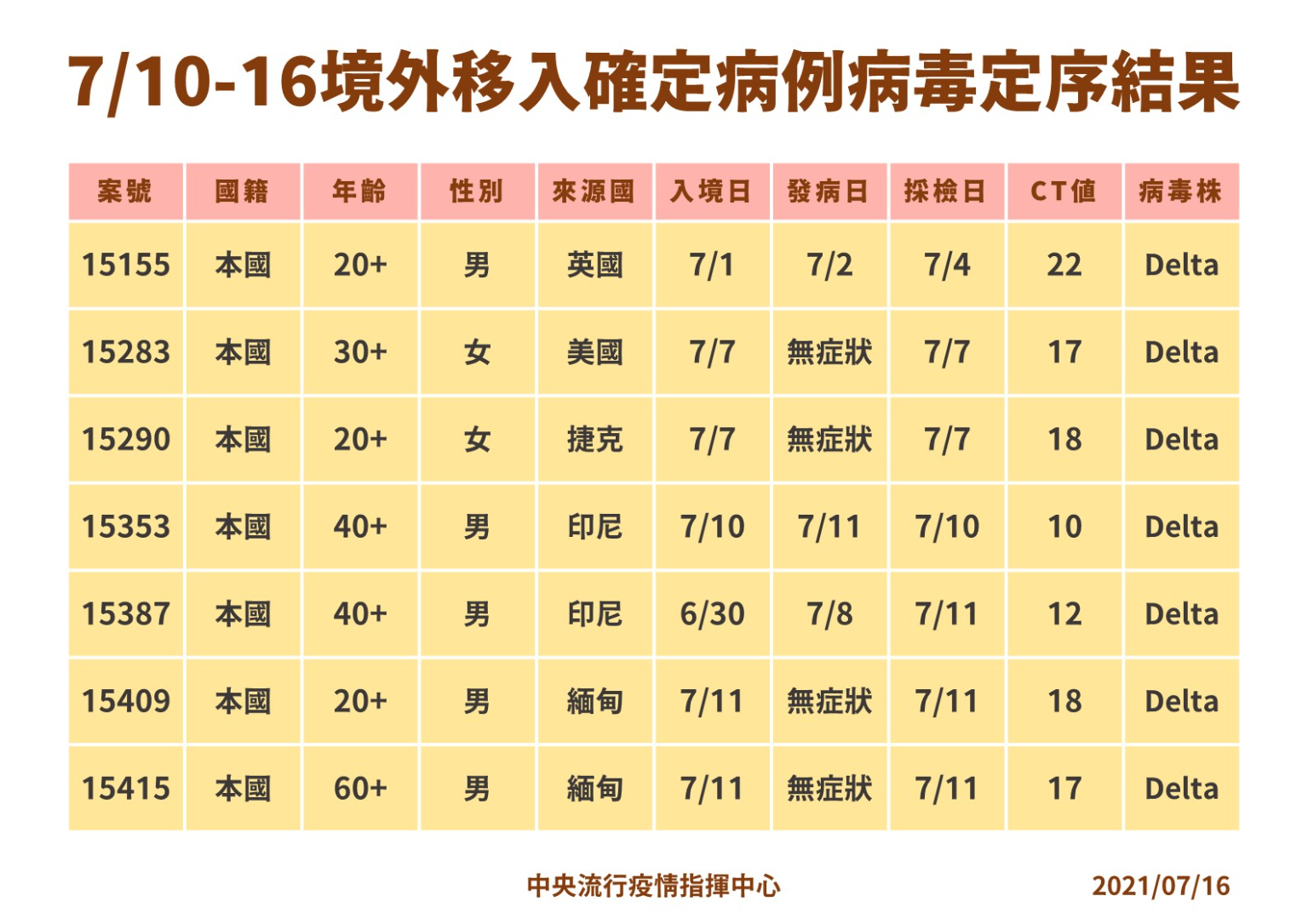 案15472為本國籍未滿10歲女童,7月2日自美國返臺,持有搭機前3日內檢驗陰性報告,入境後至防疫旅館居家檢疫,7月14日檢疫期滿前採檢,於今日確診;個案在臺期間並無症狀,已匡列接觸者2人,列居家隔離。