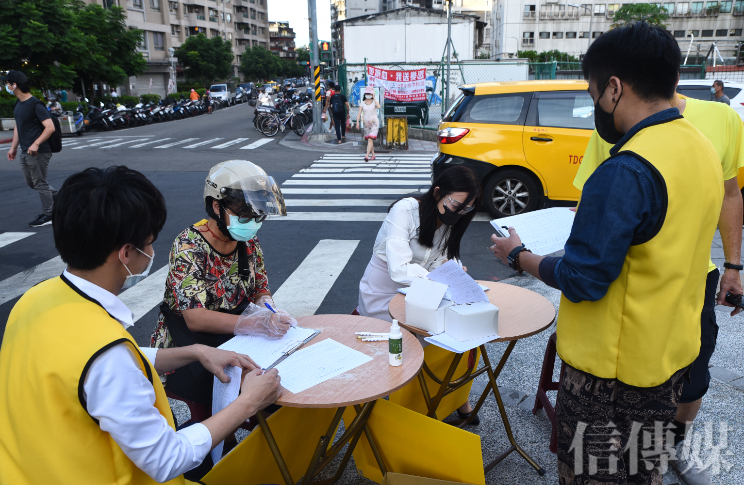 手持看板高呼口號,罷免無黨籍立委林昶佐的團體,礙於疫情,避免戶外超過10人群聚,起初連張桌子都沒有,但陸陸續續有人趕著來送件,還有戶籍在萬華的民眾,從新竹跑回來簽連署書,靠著網路以及類似的快閃宣傳活動,罷免團體有信心很快就能達標。