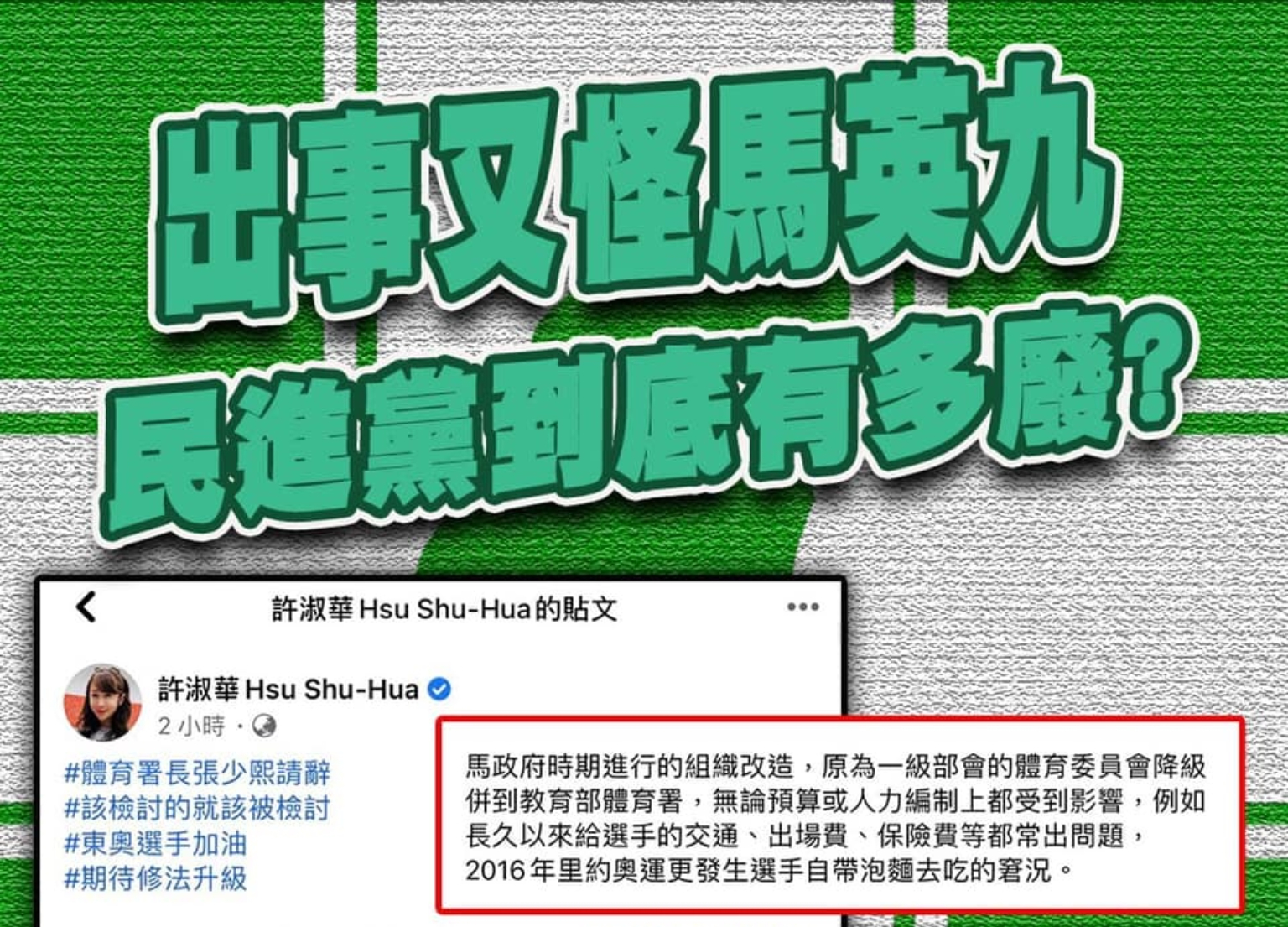 許淑華指出,「馬政府」時期進行的組織改造,原為一級部會的體育委員會降級併到教育部體育署,無論預算或人力編制上都受到影響,例如長久以來給選手的交通、出場費、保險費等都常出問題,2016年里約奧運更發生選手自帶泡麵去吃的窘況。