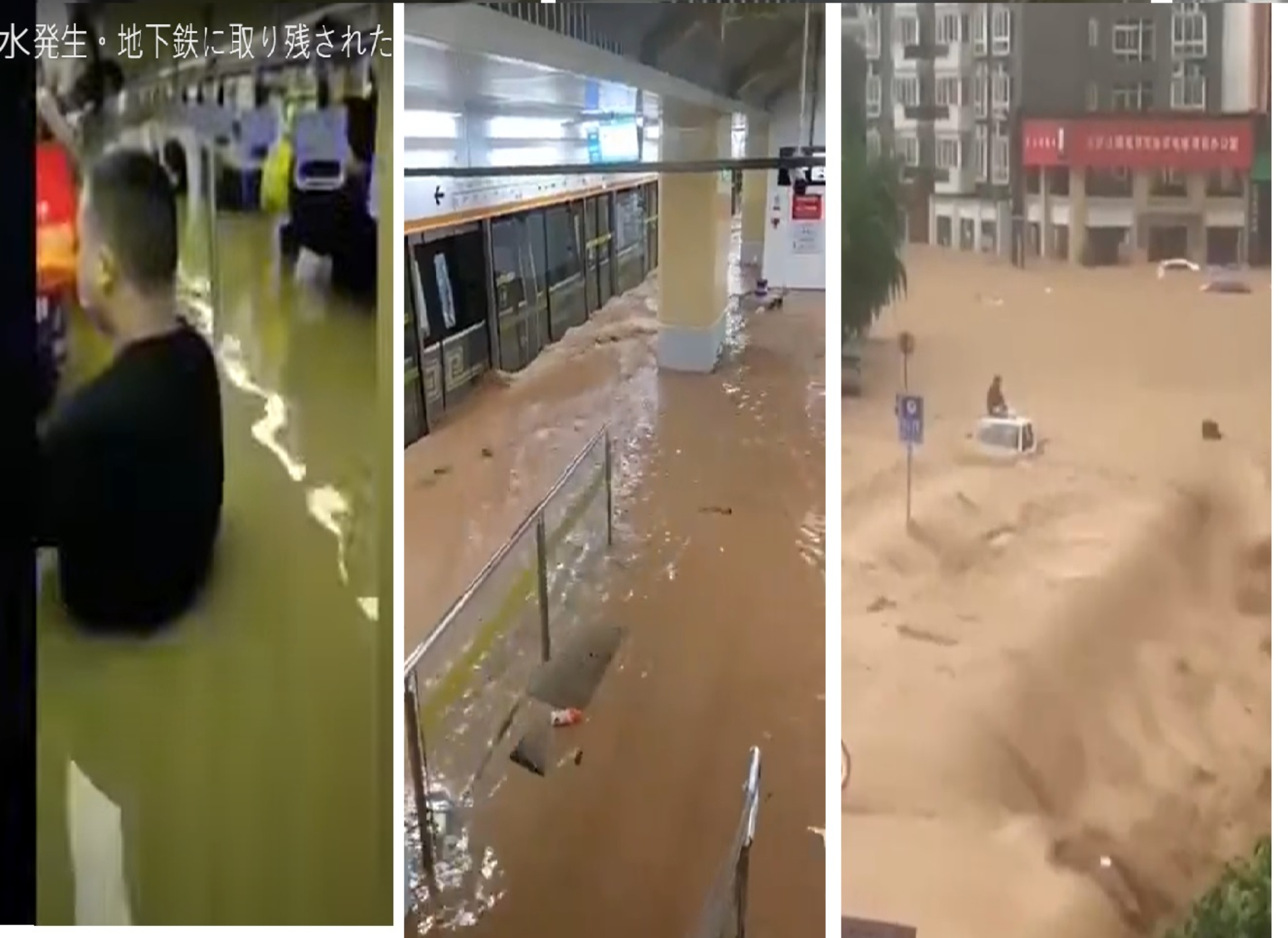 根據中國媒體報導,自18日晚間6時至21日午夜,鄭州出現罕見持續強降雨,累積平均降水量449毫米,尤其20日的豪大雨,一天之內降下全年下雨量,遠超過鄭州市內防汛標準,雖然地鐵站入口離地一公尺高,但水淹至少2、3公尺,導致大水灌入地鐵站,行駛中的地鐵終止,多人被困在車廂內,水深及胸,有民眾把影片傳上微博「不知道這是不是我生前最後一條發文」。