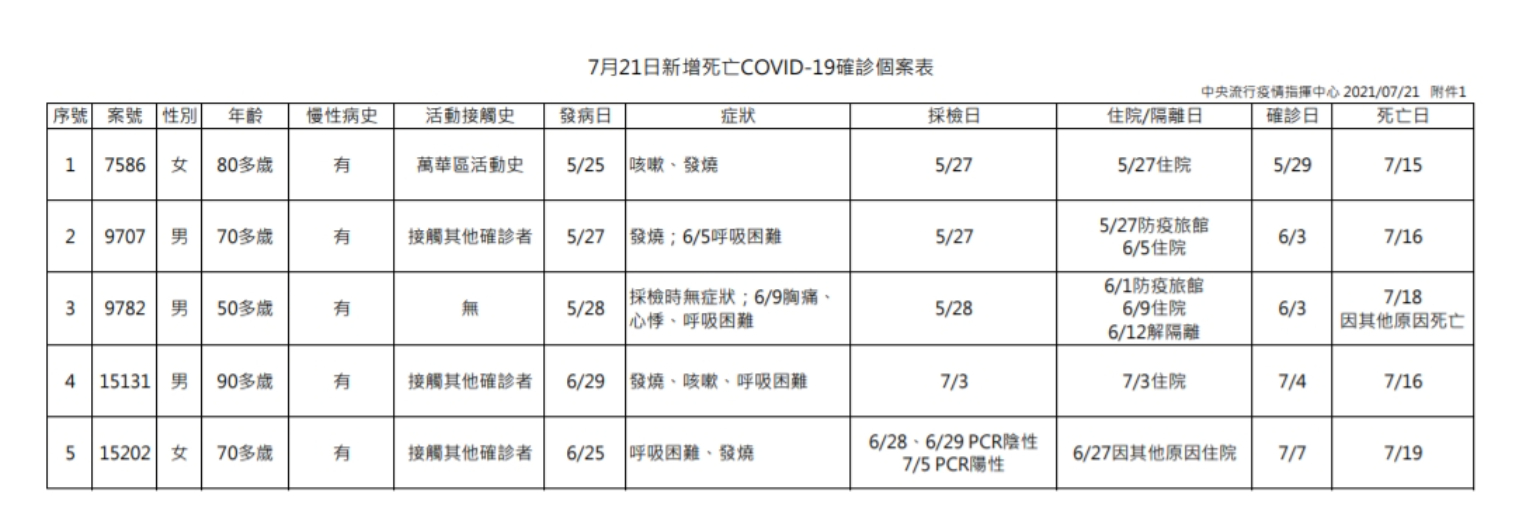 陳時中說明,今日新增5例死亡個案,為2名女性、3名男性,年齡介於50多歲至90多歲,發病日介於5月25日至6月29日,確診日介於5月29日至7月7日,死亡日介於7月15日至7月19日,詳如新聞稿附件。