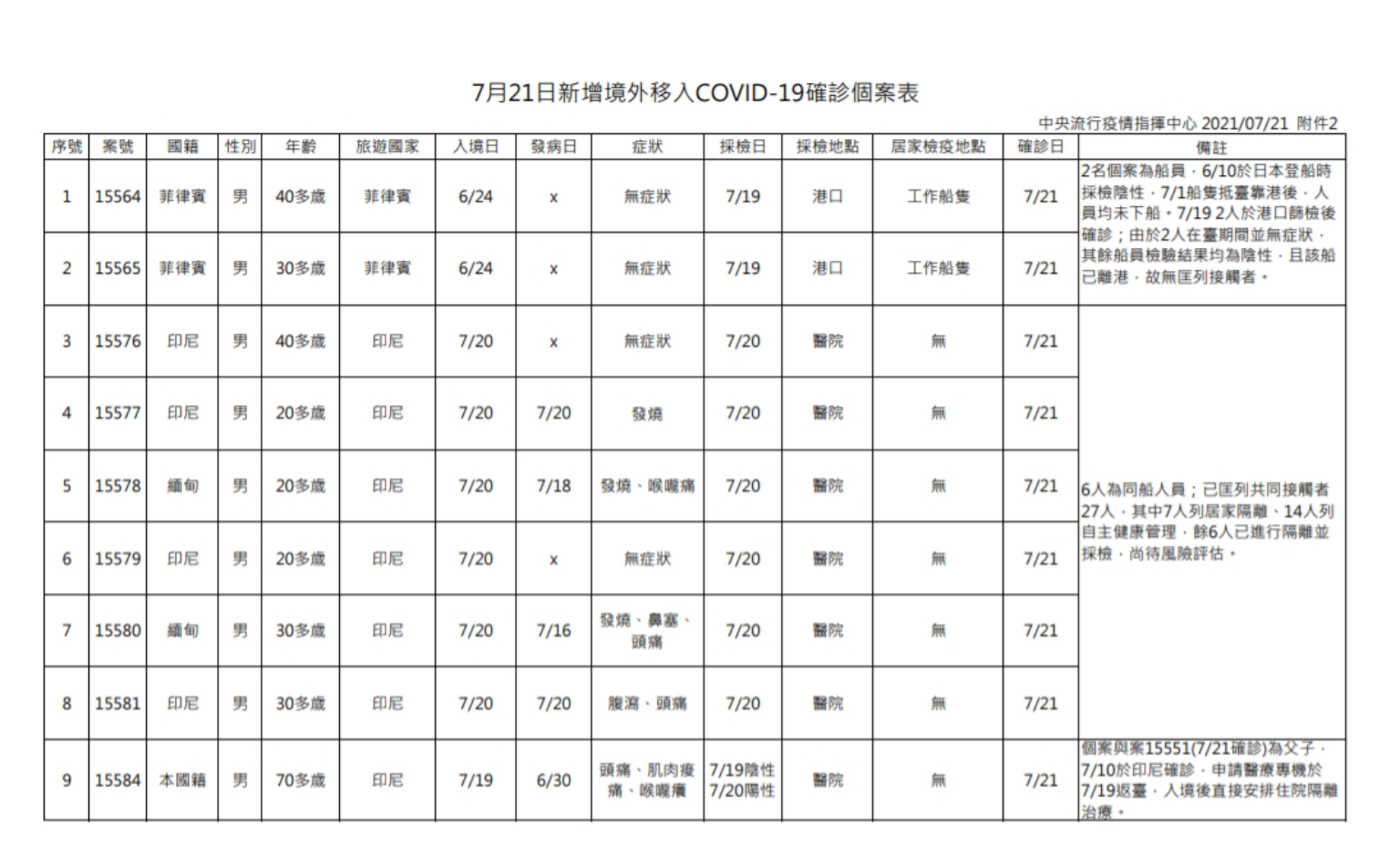 陳時中表示,今日新增9例境外移入個案,均為男性,年齡介於20多歲至70多歲,分別自菲律賓(2例)、印尼(7例)入境,入境日介於6月24日至7月20日;詳如新聞稿附件。