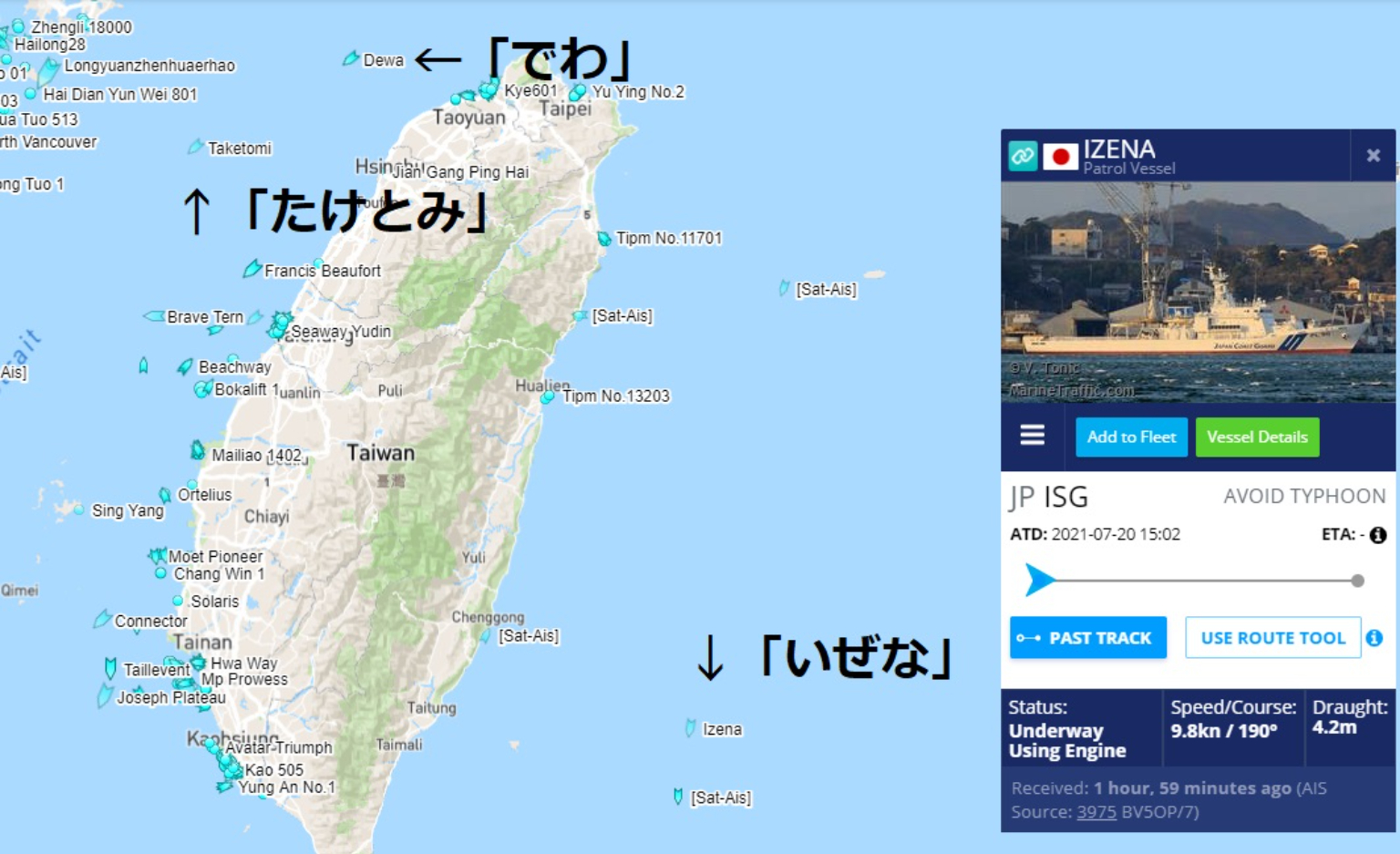 日本軍事推特《やんずJAPAN》,今日上午9時10分、11時15分連續發出3篇推文,指日本海上保安廳巡防艦艇「出羽」(でわ,PL-42)和「竹富」(たけとみ,PL-81),在台灣海峽北部由北往南航行;而「伊是名」(いぜな,PL-90)則是在台灣東部外海往菲律賓方向航行,3艘艦艇正好形成繞台之勢。