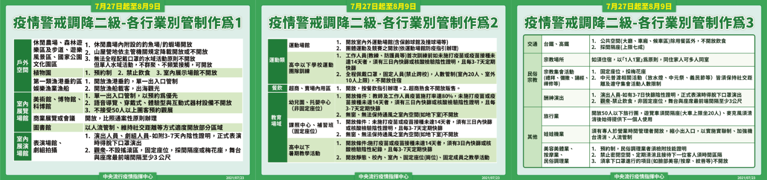 中央流行疫情指揮中心今(23)日表示,考量國內疫情及參酌其他國家之防疫調整經驗,並經與各地方政府進行溝通討論後,指揮中心自7月27日至8月9日調降疫情警戒標準至第二級,各部會得依指揮中心所發布之通案性原則另訂指引,而各地方政府亦得在此原則下,視疫情需要而有調整空間,惟相關指引必須規範明確以利民眾遵循。說明如下: