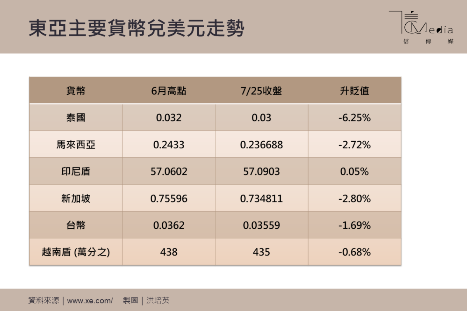 受到疫情的衝擊,泰銖自6月中以來,兌美元已貶值6%,同樣疫情惡化,但馬來西亞、新加坡兌美元貶值2.7%,其他東亞國家印尼、台灣、越南等兌美元匯率從升值0.05%到貶值1.69%之間。連MSCI泰國ETF 一個月以來跌了6.38%。
