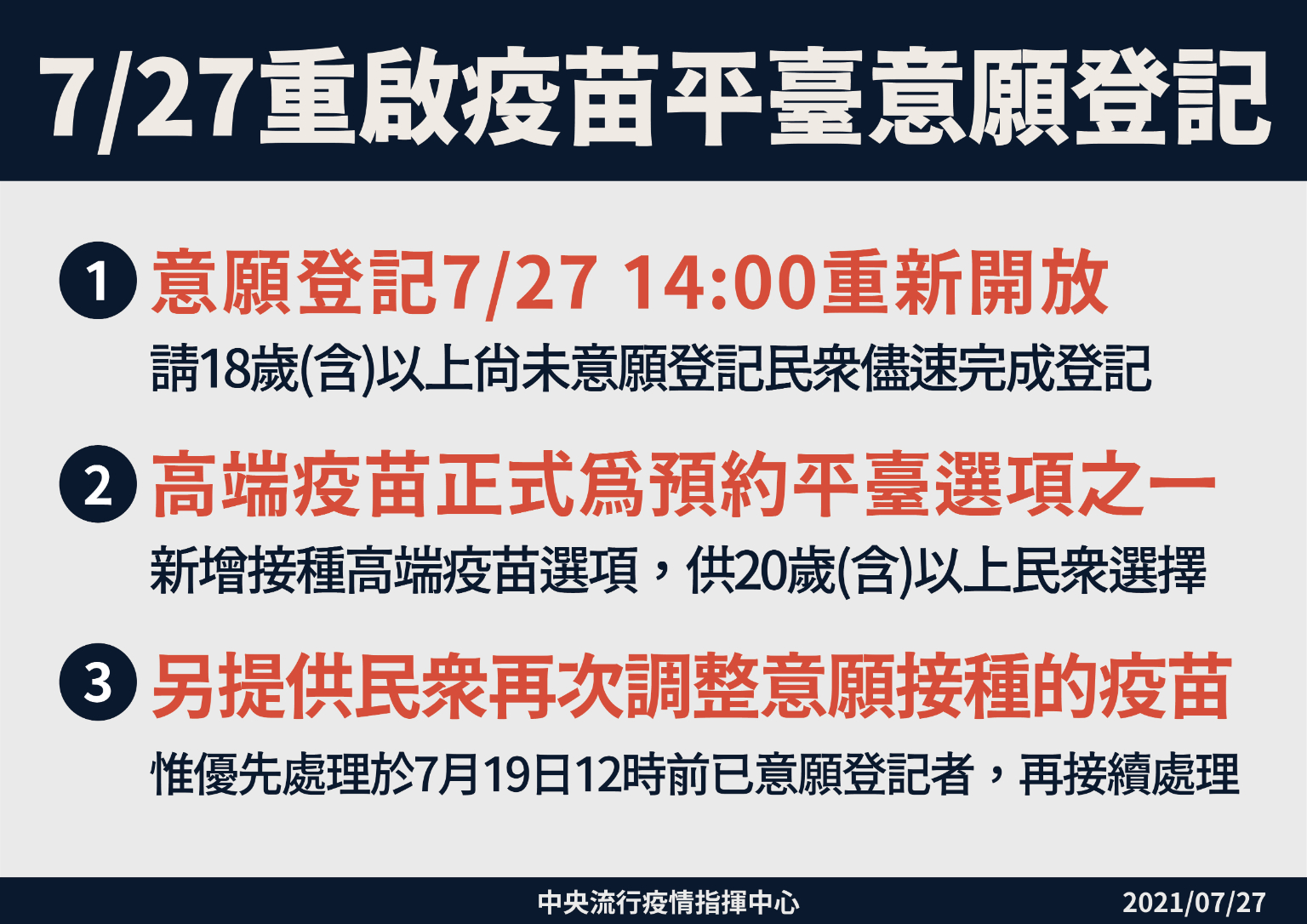指揮中心說明,此次重新開放意願登記,除新增高端疫苗供20歲以上民眾選擇外,另也可讓民眾再調整有意願接種的疫苗,惟優先處理於7月19日12時前已意願登記者,再接續處理。