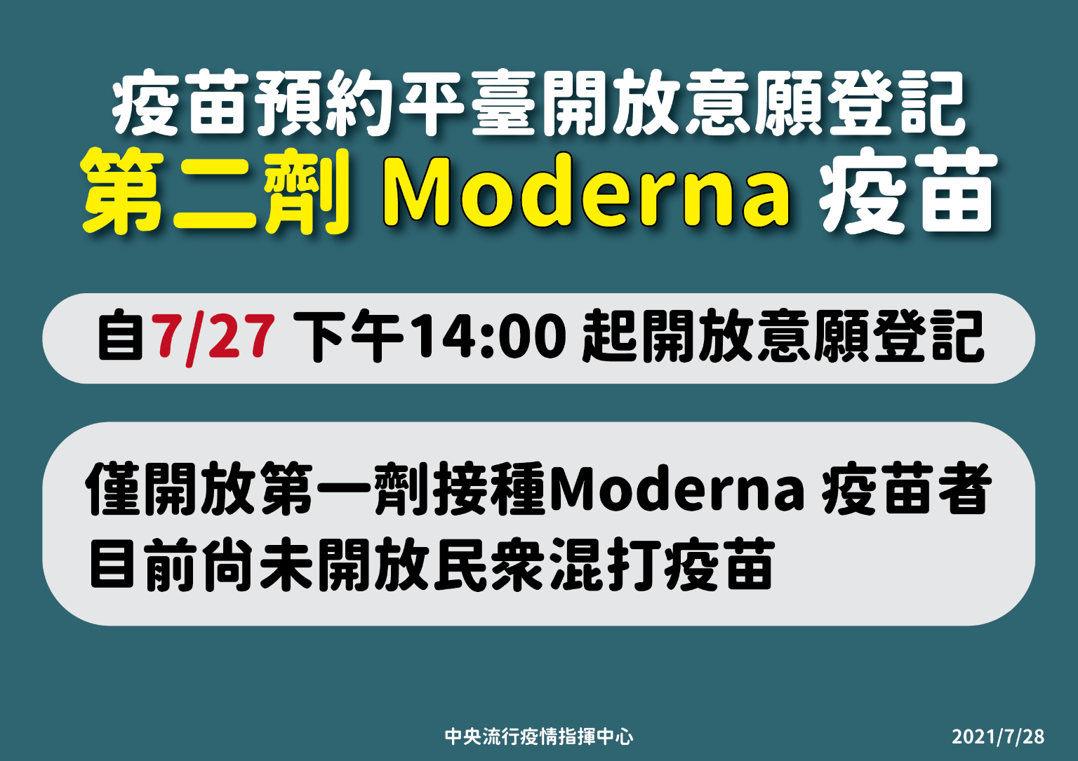 中央流行疫情指揮中心今(28)日表示,「COVID-19疫苗施打意願登記與預約系統」自昨(7/27)日14時起開放意願登記,請18歲(含)以上尚未意願登記民眾把握機會,儘速完成登記,保障自身權益。