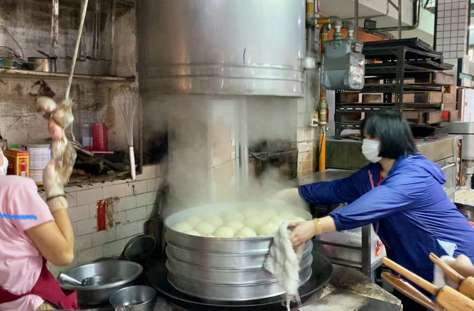 松香主要的重頭戲是肉包和壽桃,三人工作小組,麵團切塊、填入肉餡、磅秤品管、包攏定型⋯⋯一籠25個排列整齊,等六籠到齊即刻進入高高垂吊式的蒸籠大火炊蒸。這時客人陸續抵達等著,好像大家都刻意約好一起來的,何時開爐常客知道,訂購數量也都吩咐了,屏息等著。肉包快熟了,倒數計時,我瞄準掀籠的一剎那,鏡頭總是喜歡熱氣騰騰,白白胖胖的肉包現身在朦朧之間。店家快手快腳,已經開始裝袋給久候的客人。