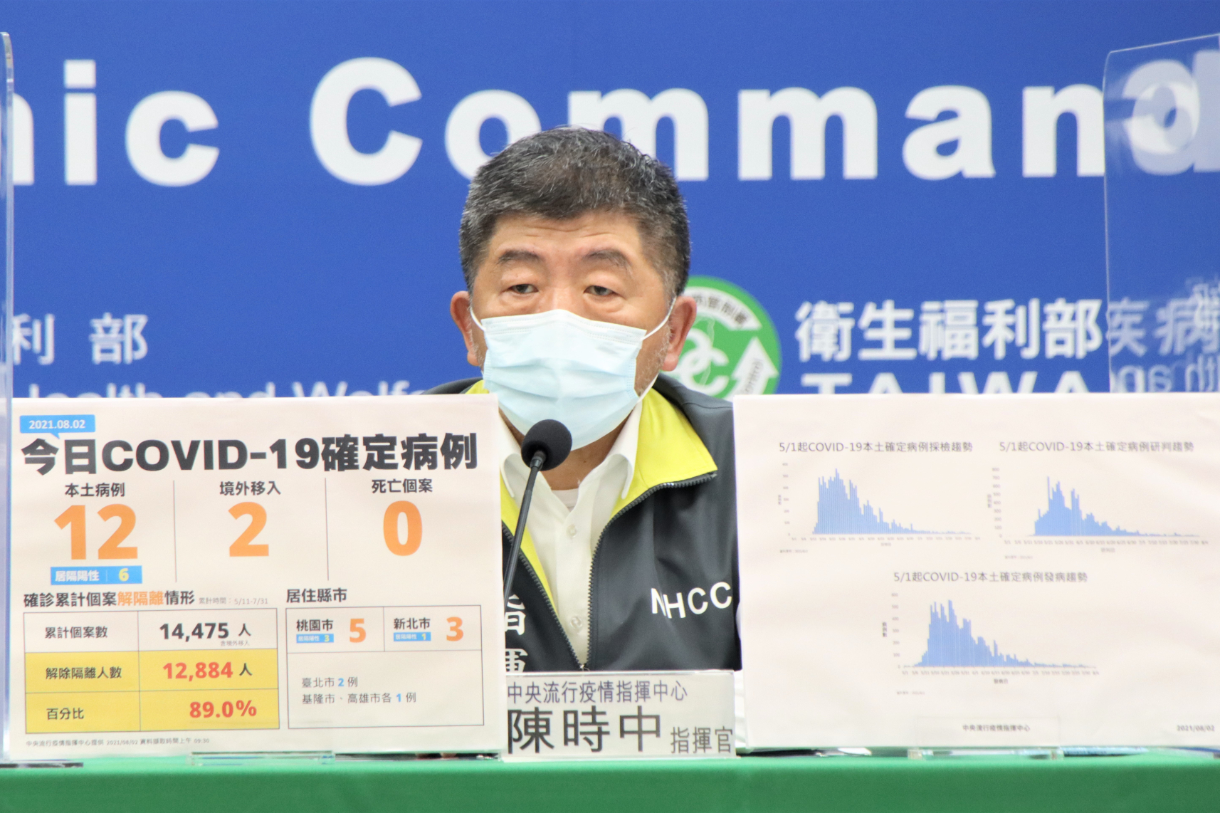 指揮中心指揮官陳時中表示,今日新增之12例本土病例(其中6例為居家隔離期間或期滿檢驗陽性者),為10例男性、2例女性,年齡介於10多歲至70多歲,發病日介於今年7月29日至7月31日。個案分布以桃園市5例為最多,其次為新北市3例、臺北市2例、基隆市及高雄市各1例。;其中9例為已知感染源、3例關聯不明,將持續進行疫情調查,以釐清感染源。