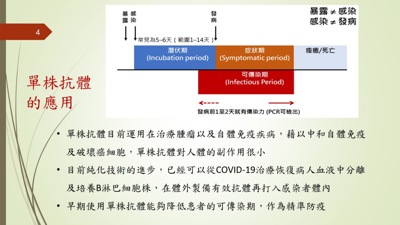 對於單株抗體在新冠肺炎的應用,盛望徽解釋,過去在腫瘤病人、自體免疫病人都有使用過,且對人體的副作用很小,「目前純化技術的進步,已經可以從COVID-19治療恢復病人血液中分離及培養B淋巴細胞株,在體外製備有效抗體再打入感染者體內。」他也強調,若早期使用單株抗體能夠降低患者的可傳染期,目前全球有超過40個不同的單株抗體在研發,在美國目前有通過3個單株抗體。