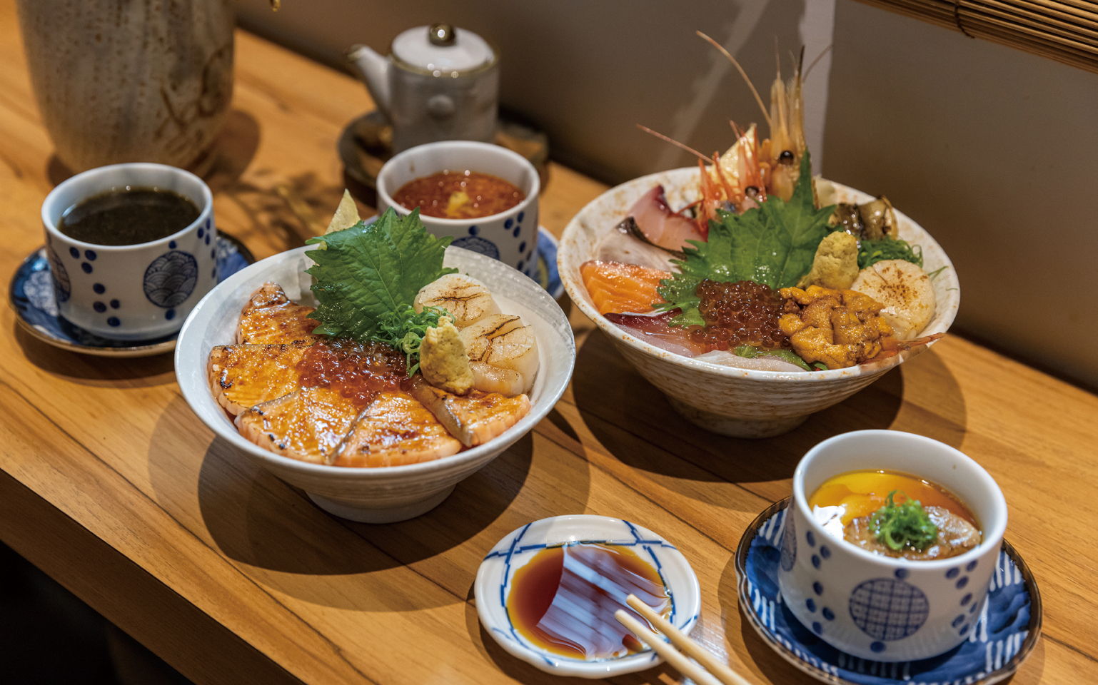 手藝師法日本,海鮮食材則來自基隆崁仔頂,丼飯的靈魂「醋飯」以花蓮農會壽司米製成,晶瑩剔透、粒粒分明。備受青睞的「松露蒸蛋」及「鴨肝蒸蛋」,入口風味濃郁而深邃;「墨の海鮮丼」上頭鋪滿鮭魚卵、海膽、干貝、炙燒星鰻、甜蝦等多種海鮮,輕咬一口,鮮味彷彿在嘴中湧現,將大海的滋味直送舌尖;「炙燒焦糖鮭魚肚丼」在鮮美脂腴的鮭魚肚撒上糖粉炙燒,甜鹹交織出好味道,咬下的霎那,忍不住綻放幸福的笑顏,用鮮美細膩的好滋味,寫下美好旅程的最終篇。