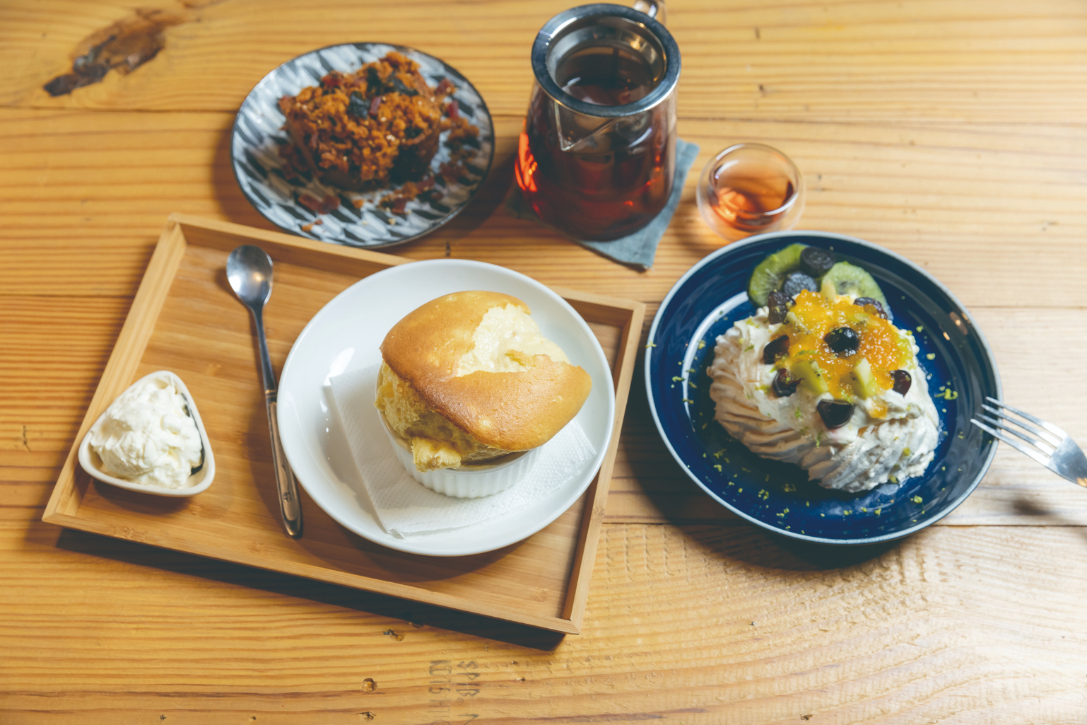 角礫也與小烏龜實驗室合作甜點,供應以在地食材製成的特色甜點,像是以肉鬆、肉乾、可可粉製成「傳香肉鬆蛋糕」,香氣濃郁、口感濕潤;以低溫烘烤的蛋白霜為基底的「鮮果帕芙洛娃」,外脆內軟,再夾入鮮奶油、刨上些許檸檬皮、綴以當季水果,風味酸甜迷人,讓人在享受藝文氣息之餘,連味蕾也能得到最好的照顧。