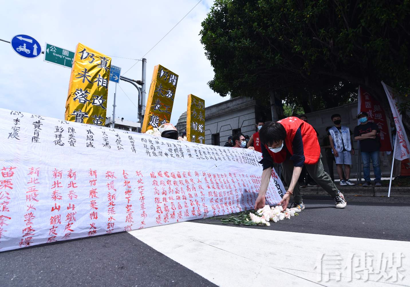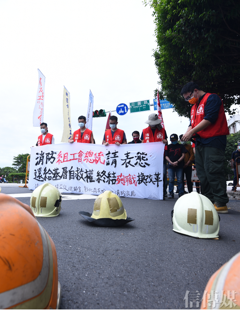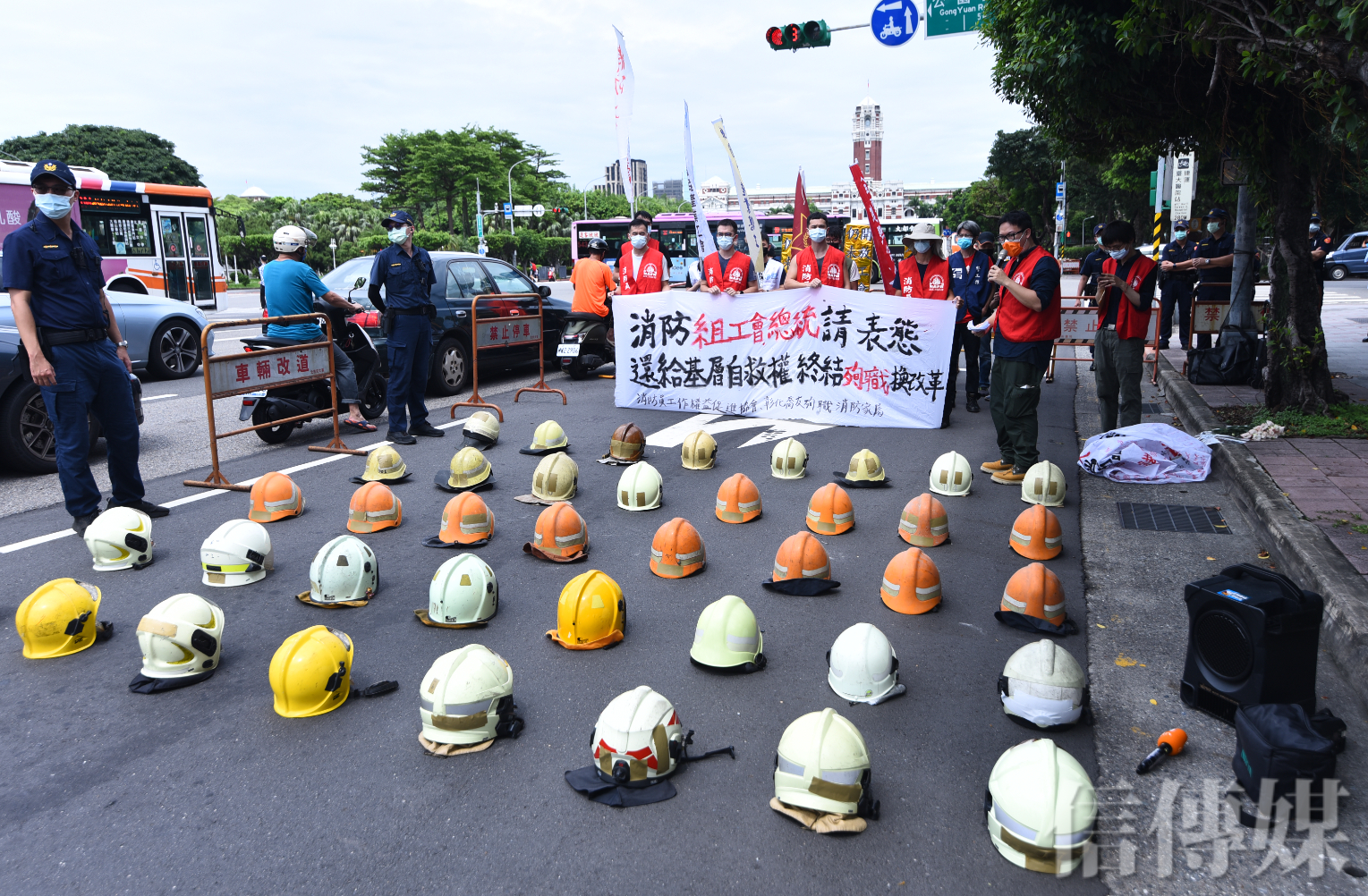 今(5)日消防員工作權益促進協會及彰化喬友火警殉職案家屬上午在凱道舉行消防員組工會記者會,協會代表及聲援團體先進行默哀儀式。