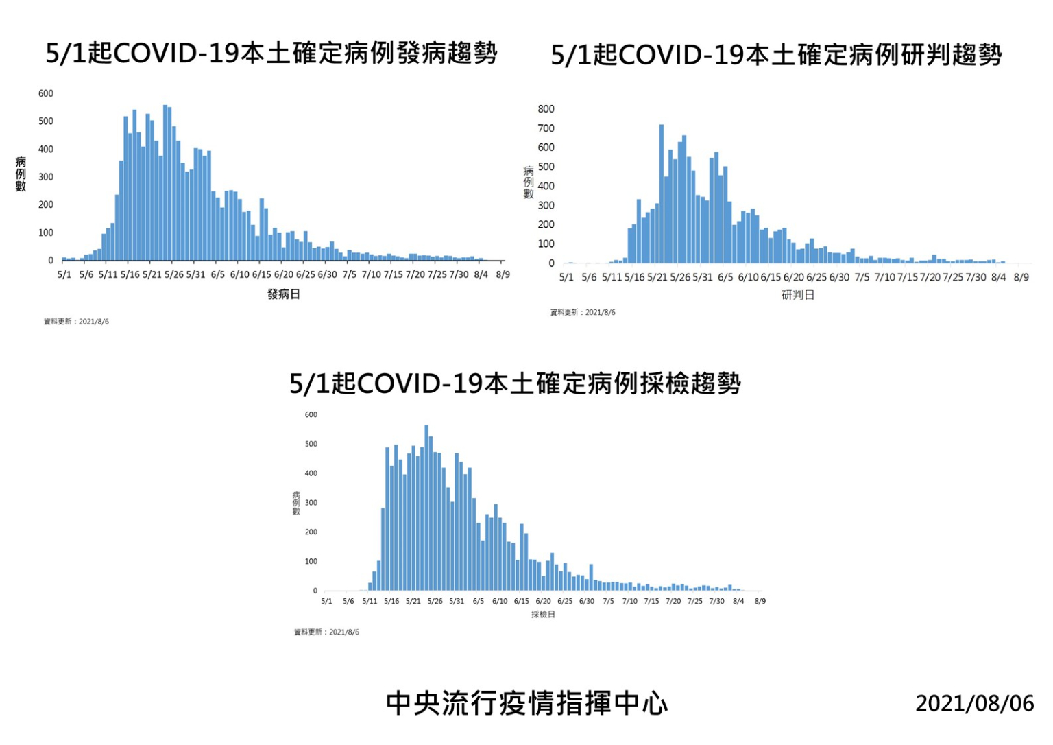 指揮中心指揮官陳時中表示,今日新增之10例本土病例(其中7例為居家隔離期間或期滿檢驗陽性者),為5例男性、5例女性,年齡介於未滿10歲至60多歲,發病日介於今年8月4日至8月5日。個案分布以新北市4例為最多,其次為臺北市3例、嘉義縣2例、彰化縣1例;其中8例為已知感染源、1例關聯不明、1例疫調中,將持續進行疫情調查,以釐清感染源。