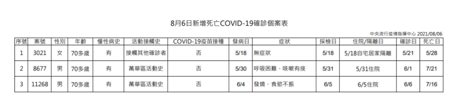 陳時中說明,今日新增3例死亡個案,為2例男性、1例女性,年齡均為70多歲且未接種COVID-19疫苗,發病日介於5月18日至6月4日,確診日介於5月21日至6月6日,死亡日介於5月28日至7月21日;詳如新聞稿附件。