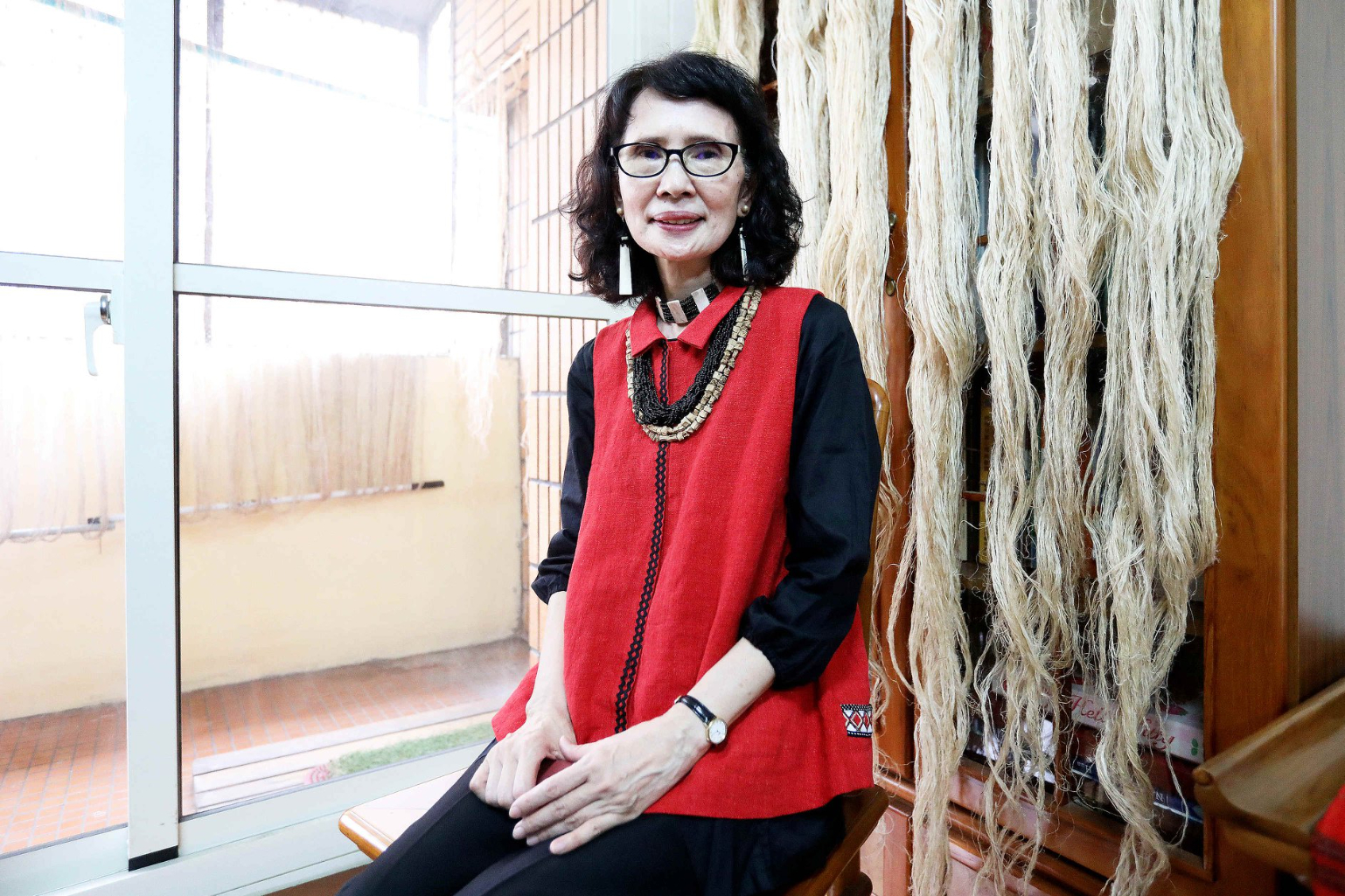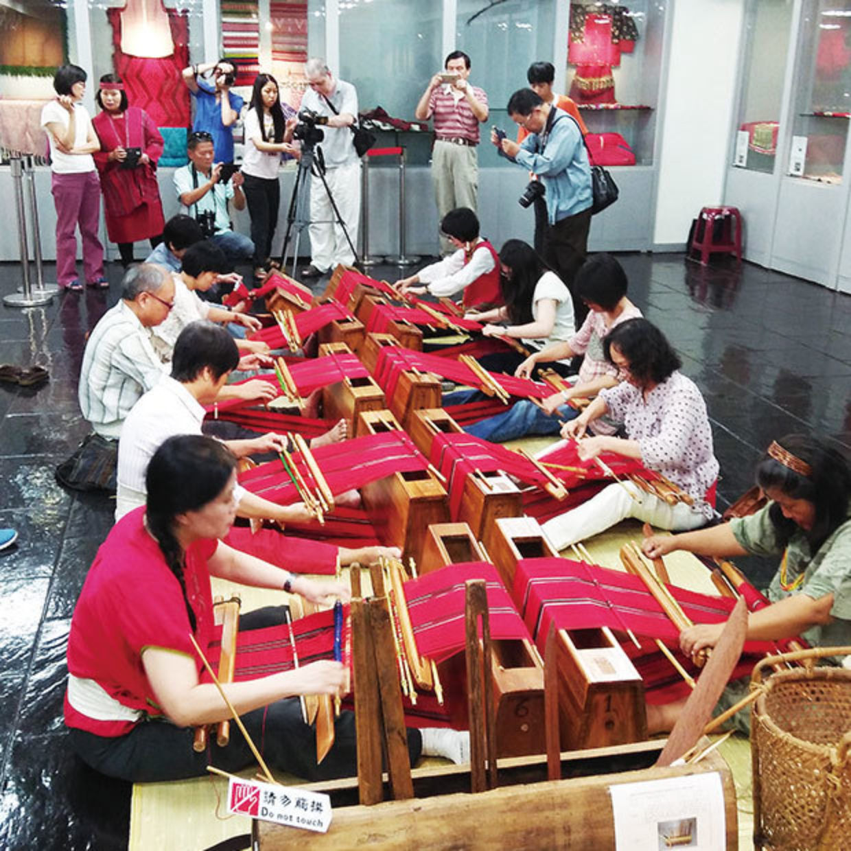 ,織作時必須全程坐在地板上,十分辛苦。圖為張鳳英師生在教學成果展中以地機織作。.jpeg)