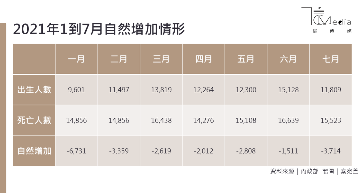 2020年為台灣人口負成長元年,這樣的頹勢到了今年還在持續,內政部最新統計,7月出生人數為1萬1809人、死亡數為1萬5523人,自然增加為-3714人,且台灣已連續7月自然增加都為負成長。