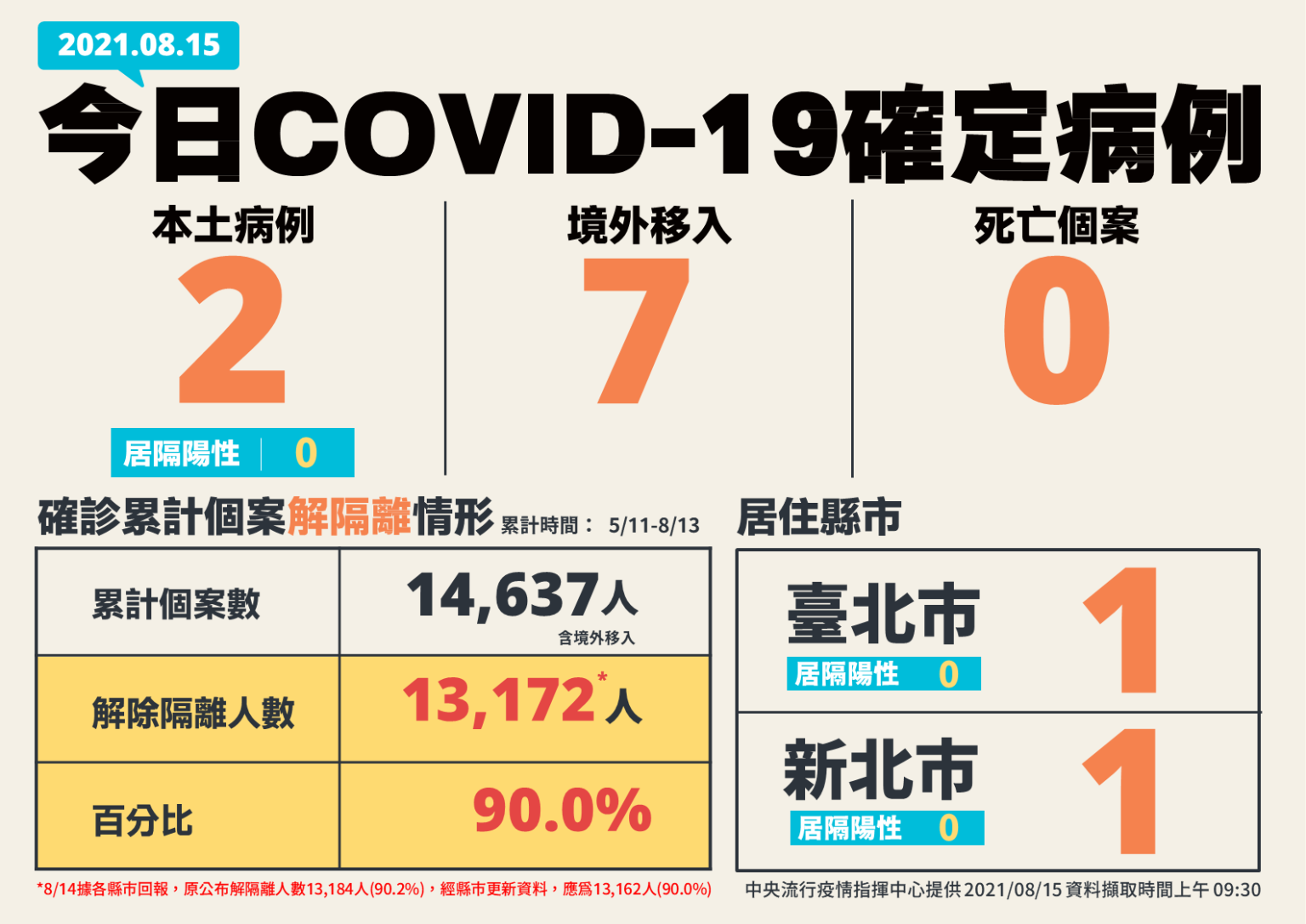陳時中指出,近期確診個案解隔離情形,5月11日至8月13日累計公布14,637位確診個案中,已有13,172人解除隔離,解隔離人數達確診人數90.0%。