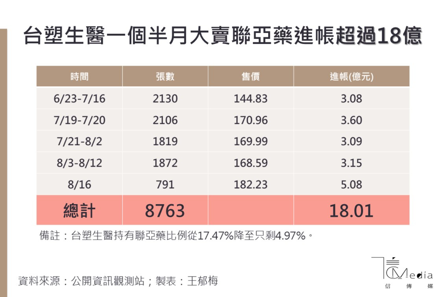 根據16日的公告,在8月13日到16日之間,也就是專家會議開會、指揮中心對外公布緊急授權結果出來前後,台塑生醫又賣了2791張,平均每張賣182.23元,賣完之後對聯亞持股比例降到7.62%,帳上還持有5240張的聯亞藥,從公告的數字來看,台塑生醫在聯亞EUA審查前後,就已經賣掉手中超過一半的持股。