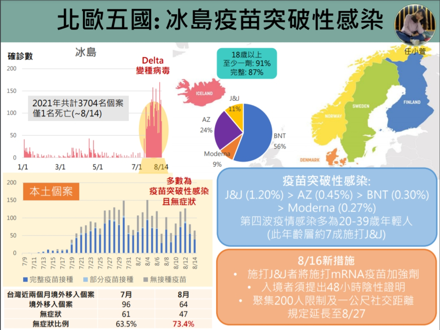 要注意的還有冰島,其18歲以上至少施打一劑高達91%,完整接種也相當高87%,但仍發生疫苗突破性感染,疫情在7月急遽升溫。