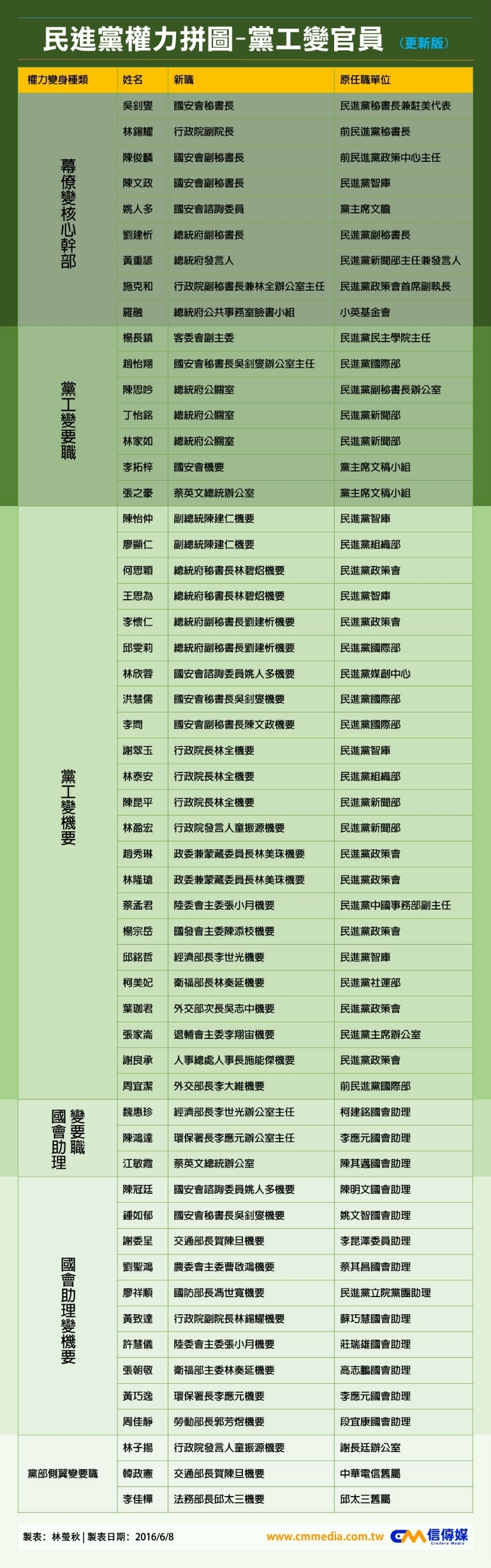 值得一提的是,跟著小英一路研究「十年政綱」、蹲馬步練苦功的政策幕僚,包括民進黨政策會、智庫和小英基金會,堪稱是這次內閣人事改組的大贏家,全部都沾小英的光,獲得最大報償,帶著他們尚未完成的政策成果,分派進入府院黨擔任機要幕僚,最是炙手可熱。以政策會為例,有三分之二的人被外派出去各單位當機要,「升官」比例最高。