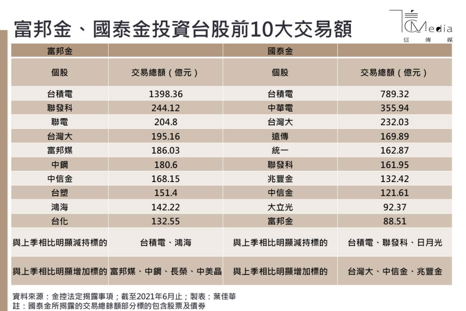 至於國泰金則減持聯發科及日月光的交易額,截至今年第二季為止,國泰金前十大交易額標的分別是,台積電、中華電、台哥大、遠傳、統一企業、聯發科、兆豐金、中信金、大立光以及富邦金,其中多數則包括股票及債券。