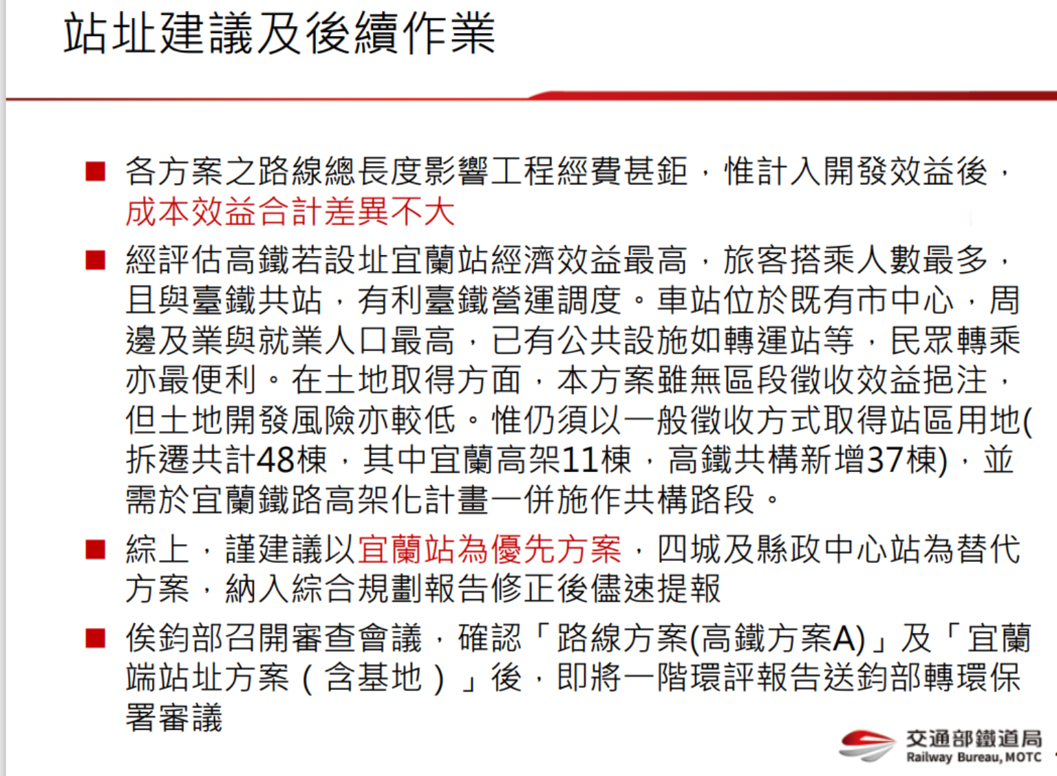 甚至交通部長王國材對外還指出「一開始就是選四城」,但根據今年5月交通部鐵道局就宜蘭端設站規劃對行政院高層進行的簡報內容,當中明確建議以宜蘭站為優先方案,指出高鐵若設址宜蘭站經濟效益最高,旅客搭乘人數最多,且與台鐵共站,有利台鐵營運調度;在土地取得方面,宜蘭站雖沒有區段徵收效益挹注,但土地開發風險相對較低。