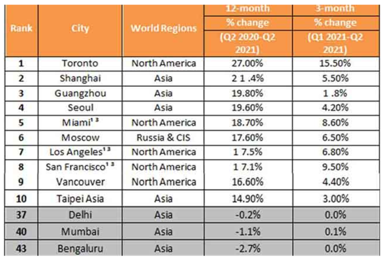 緊接在後,漲幅位居2至4名為亞洲城市,無視最近一系列防疫限制措施。第2季,上海豪宅價格上揚21%,廣州上漲 19.8%,首爾豪宅價格上漲19.5%。5至10名豪宅漲幅依序為邁阿密、莫斯科、洛杉磯、聖彼得堡、溫哥華與台北。