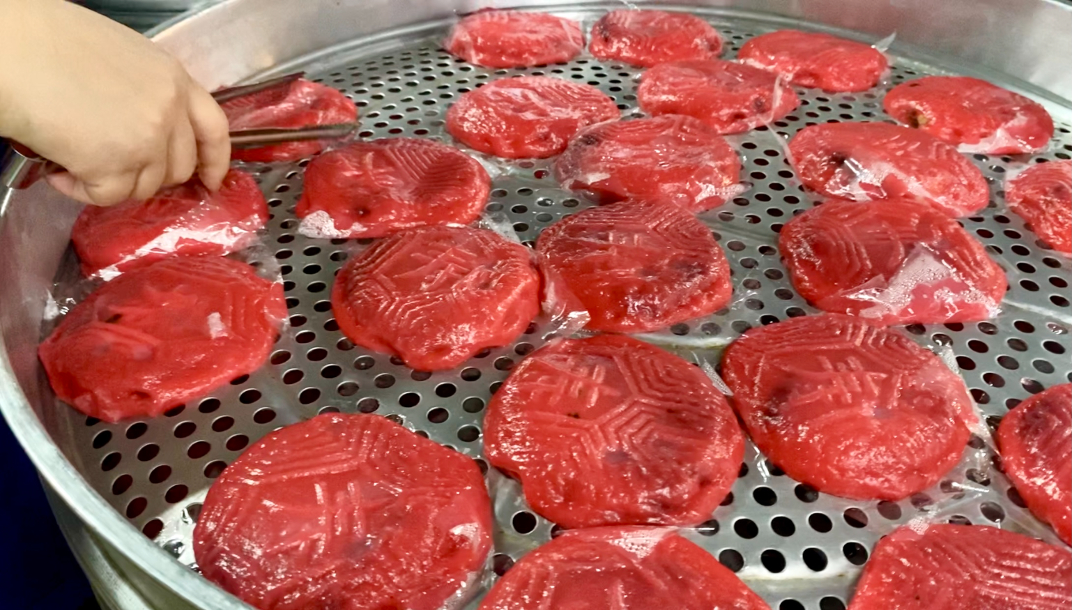 約是清晨四點半,第二代蘇富南獨自到了餅舖攤位,開燈,敞亮了依舊熟睡的鴨母寮市場。他先備料、蒸爐開火、揉麵團、製作麻糬等,一個多小時後家人們陸續抵達,沒有工作指令,六七人緘默分工,有製作肉包內餡的,有開始把紅豆餡、豌豆黃餡包入染紅麻糬裡,它們是府城傳統節慶壽誕所必備的紅圓與紅龜粿,也是松香的熱門食品。豌豆黃餡,就是椪豆豆沙,有點像綠豆沙,但是口感層級高明多了。