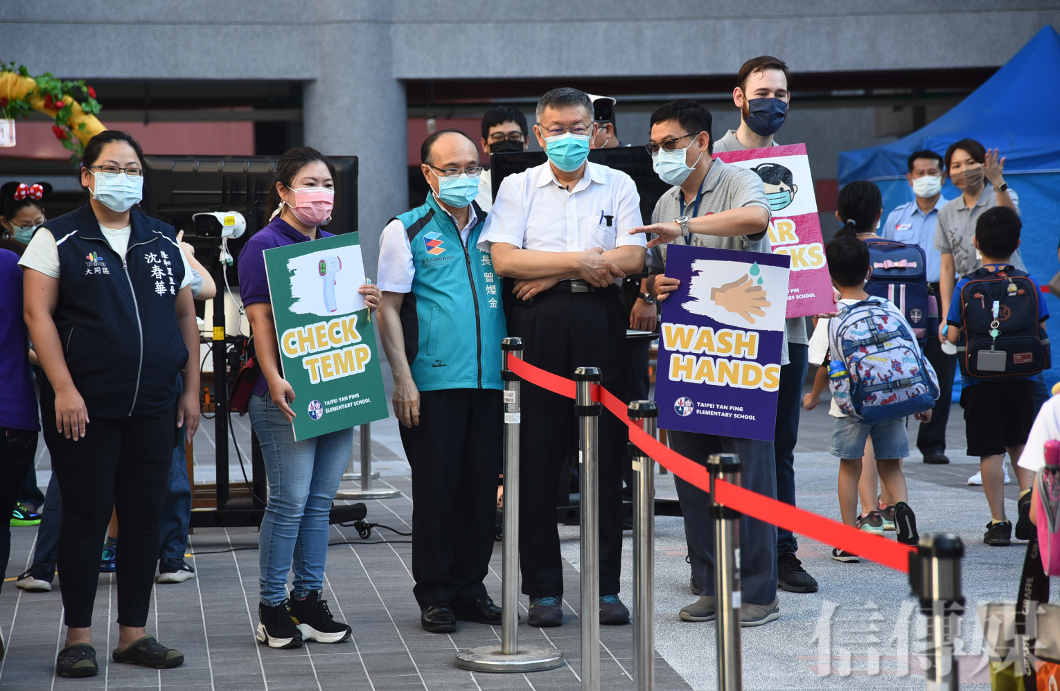 台北市長柯文哲一早赴延平國小視察開學防疫作業,他表示,台北市幼稚園、國小、國中、高中高達28萬人,因此今天人流會瞬間上升,也增加感染風險,不可諱言社區仍有感染源,所以一定要在最大人流的校園裡做好防疫。