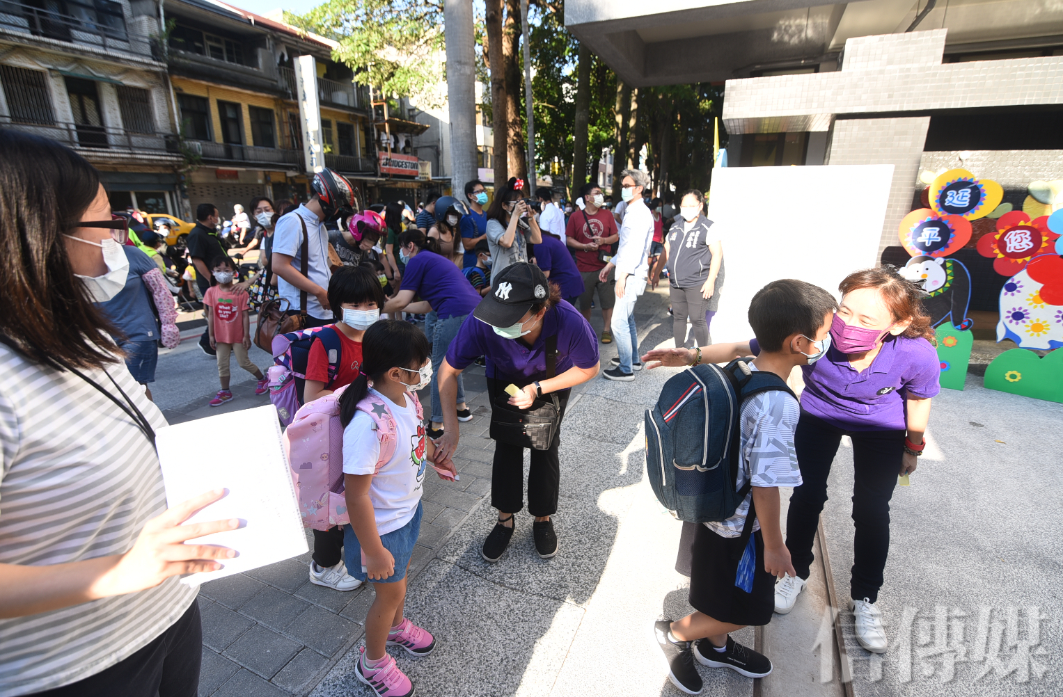 由於家長及訪客不能進入校園,家有小一新生的家長把孩子送到學校大門口,就由老師和志工接手帶到教室,從幼稚園到小一,是孩子必經的成長過程,不過家長大多很難放心,有的小朋友初次進入校園怕生,還有家長就一直站在校門口,來來回回幾趟勸孩子快進學校。
