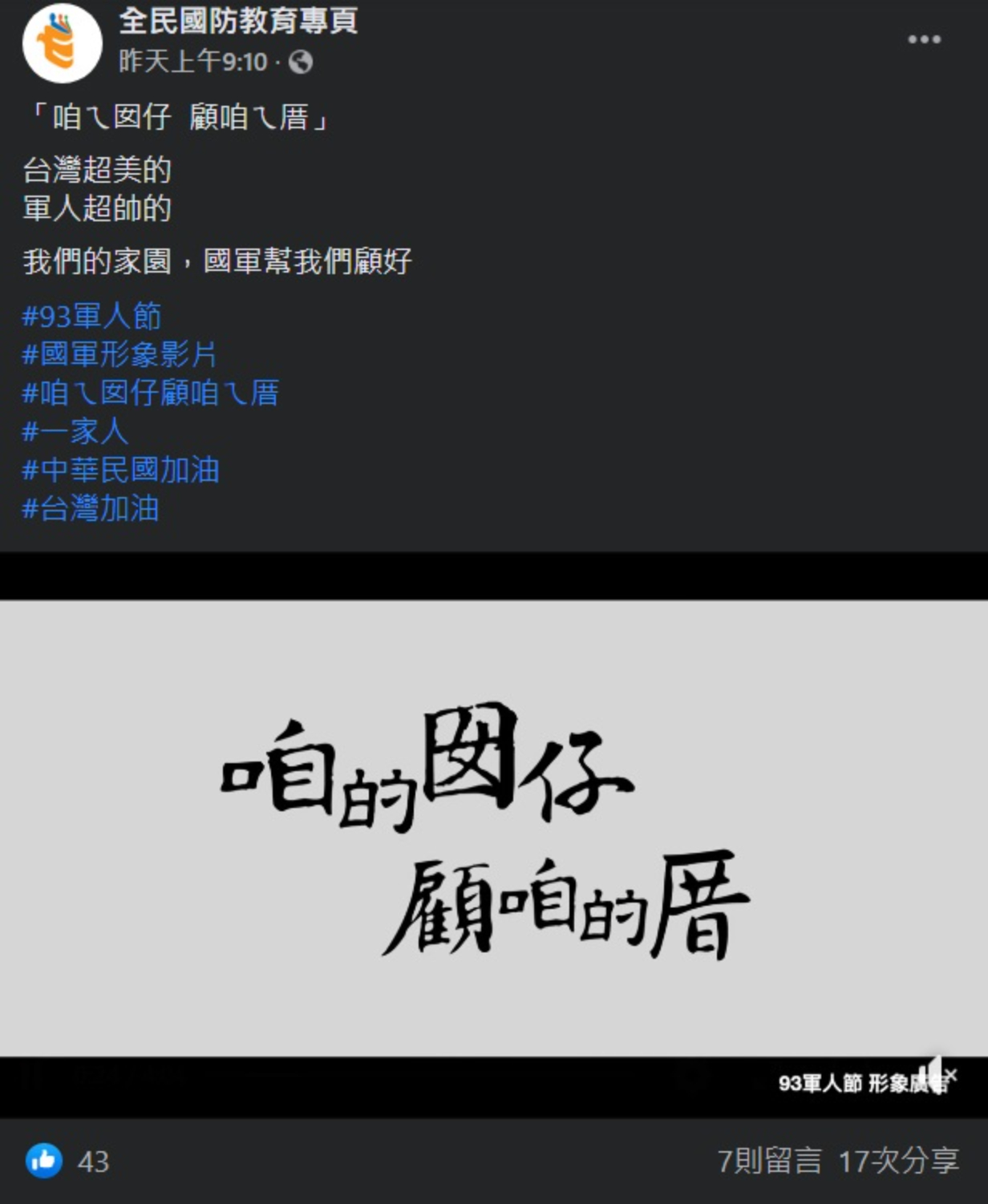 據悉,許多黃復興老兵都在流傳,蔡政府會不會是把軍人節的活動經費拿去「養網軍」,因為那些網軍梗圖隨便都幾千、幾萬讚,慶祝軍人節卻只有區區不到50讚。