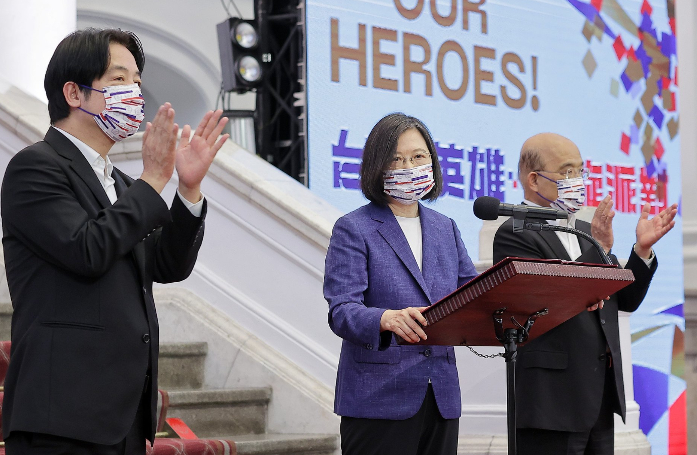 蔡英文表示,政府會繼續推動黃金計畫,希望大家帶著今年夏天的感動,繼續做選手後盾;賴清德則說,他最想說的就是感謝,因為台灣隊在疫情當中凝聚了國人。