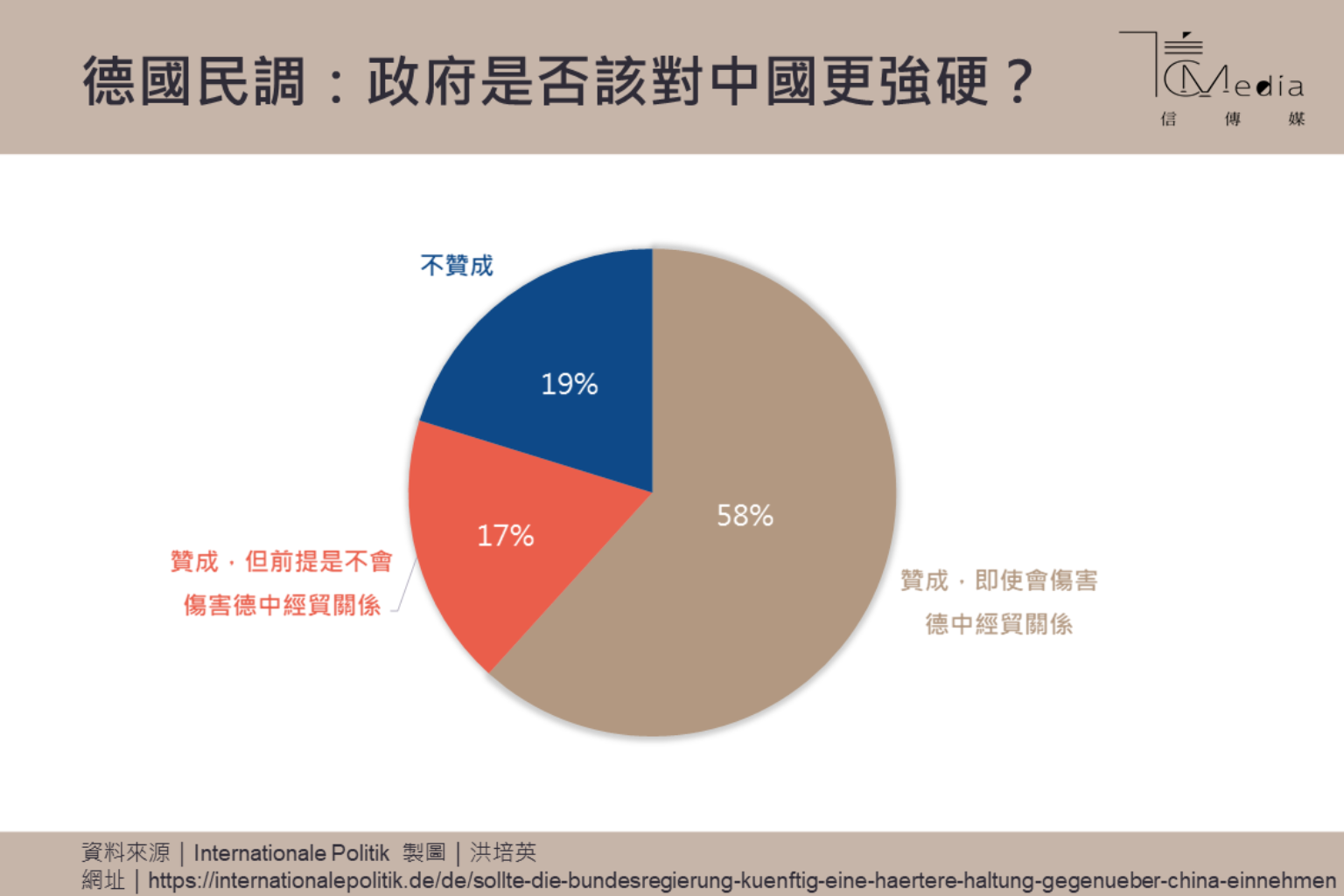 德國雜誌《國際政治》(Internationale Politik)委託「佛爾沙研究中心」(Forsa)執行的民調在8月底發現,58%德國民眾贊成政府「對中國採取更強硬態度並積極維護國家利益,即便這將有損德中經濟關係」。