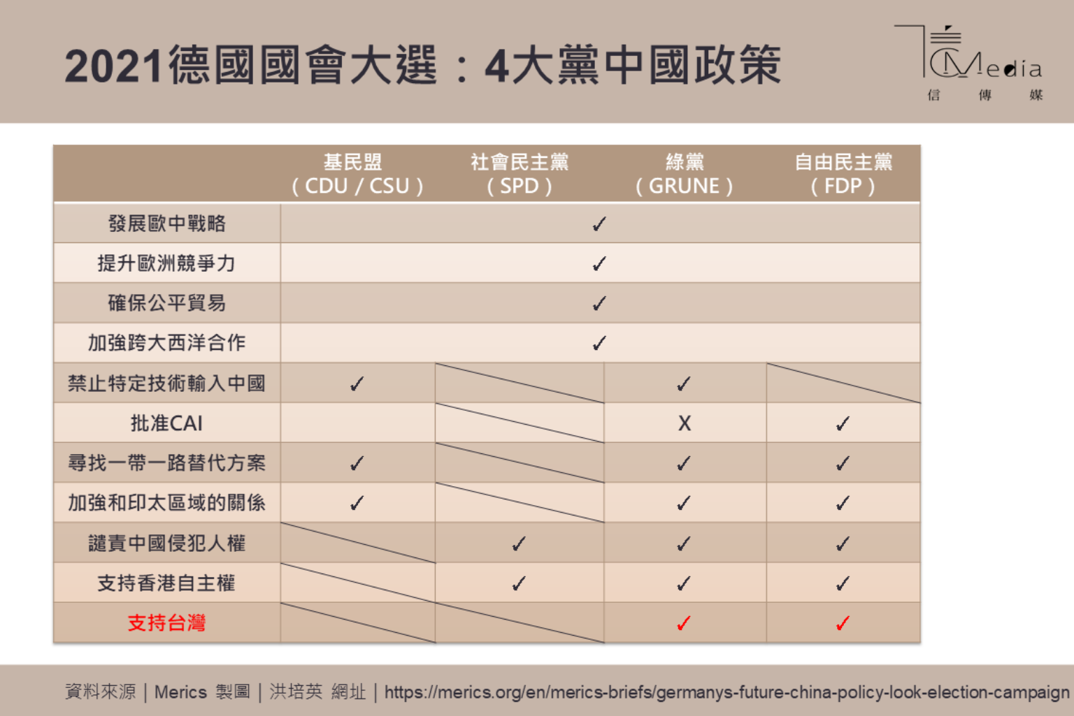 相形之下,民調居於三、四位的綠黨和自民黨對抗中最為積極熱衷,綠黨明言反對批准CAI、支持台灣,其總理候選人貝爾伯克(Annalena Baerbock)曾是國會友台小組成員;自民黨5月則撤下了其競選網站的「支持一中政策」聲明。