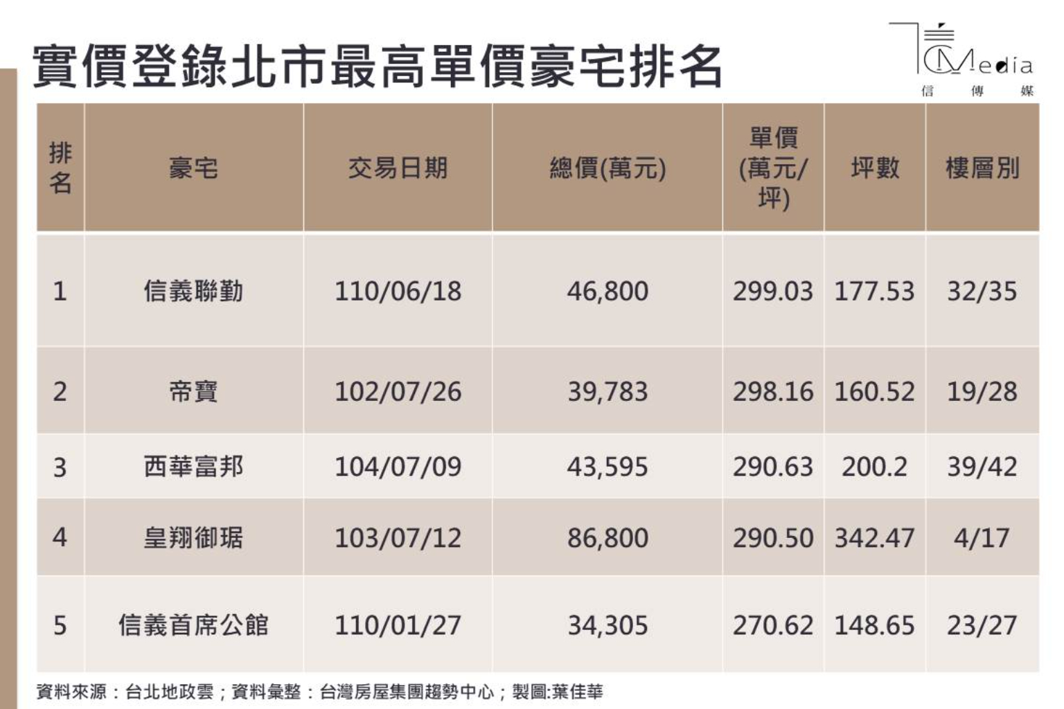 其次則依序是大安區「帝寶」、大直指標豪宅「西華富邦」、信義計畫區豪宅「皇翔御琚」,至於市場曾傳言信義計劃區豪宅「信義首席公館」頂樓戶交易有望突破彭淮南防線,由於尚未揭露,目前「信義首席公館」則暫居第5名。
