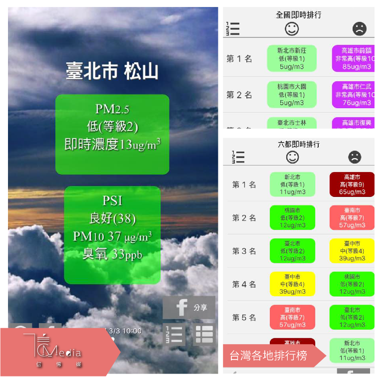 這一款應用程式沒有太複雜的介面,如果討厭複雜介面的人非常適合。程式一打開就會定位自己所在位置,即時的回饋空氣資訊,也用顏色分類危險程度,甚至也可以透過臉書分享給好友知道。想要再進階一點也可以透過右下角的「排行」按鈕,更可以看到全台灣各地的空氣資訊、即時排行。